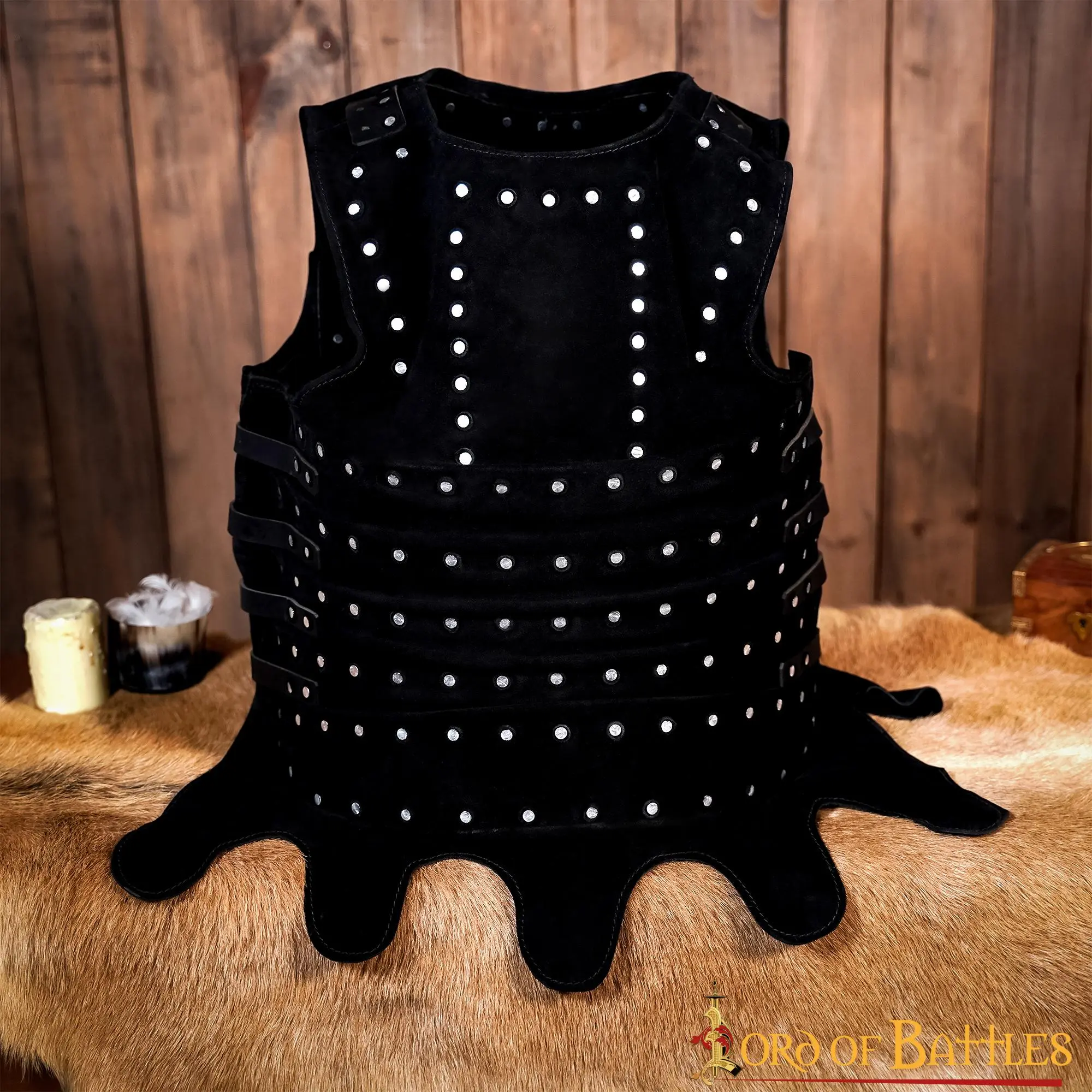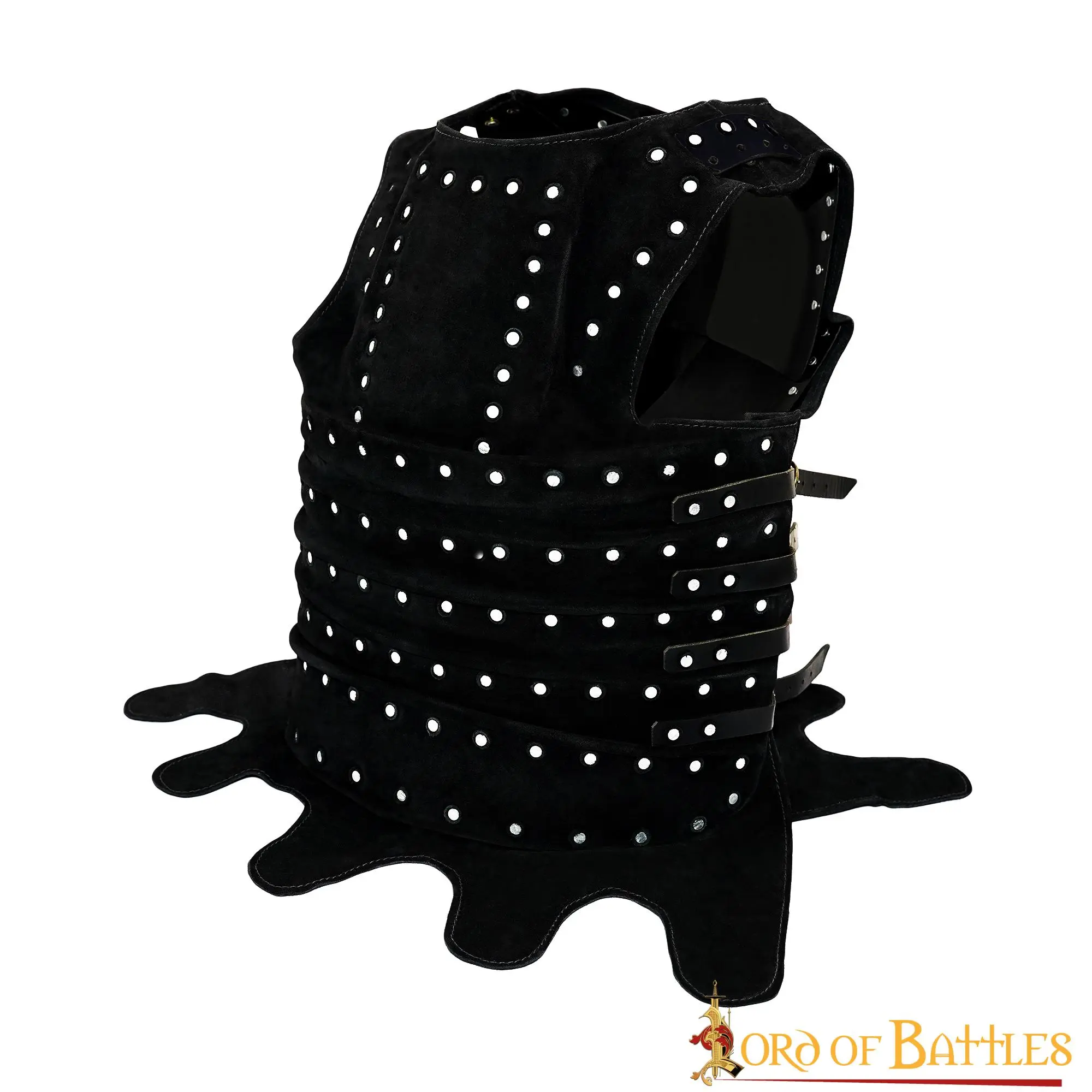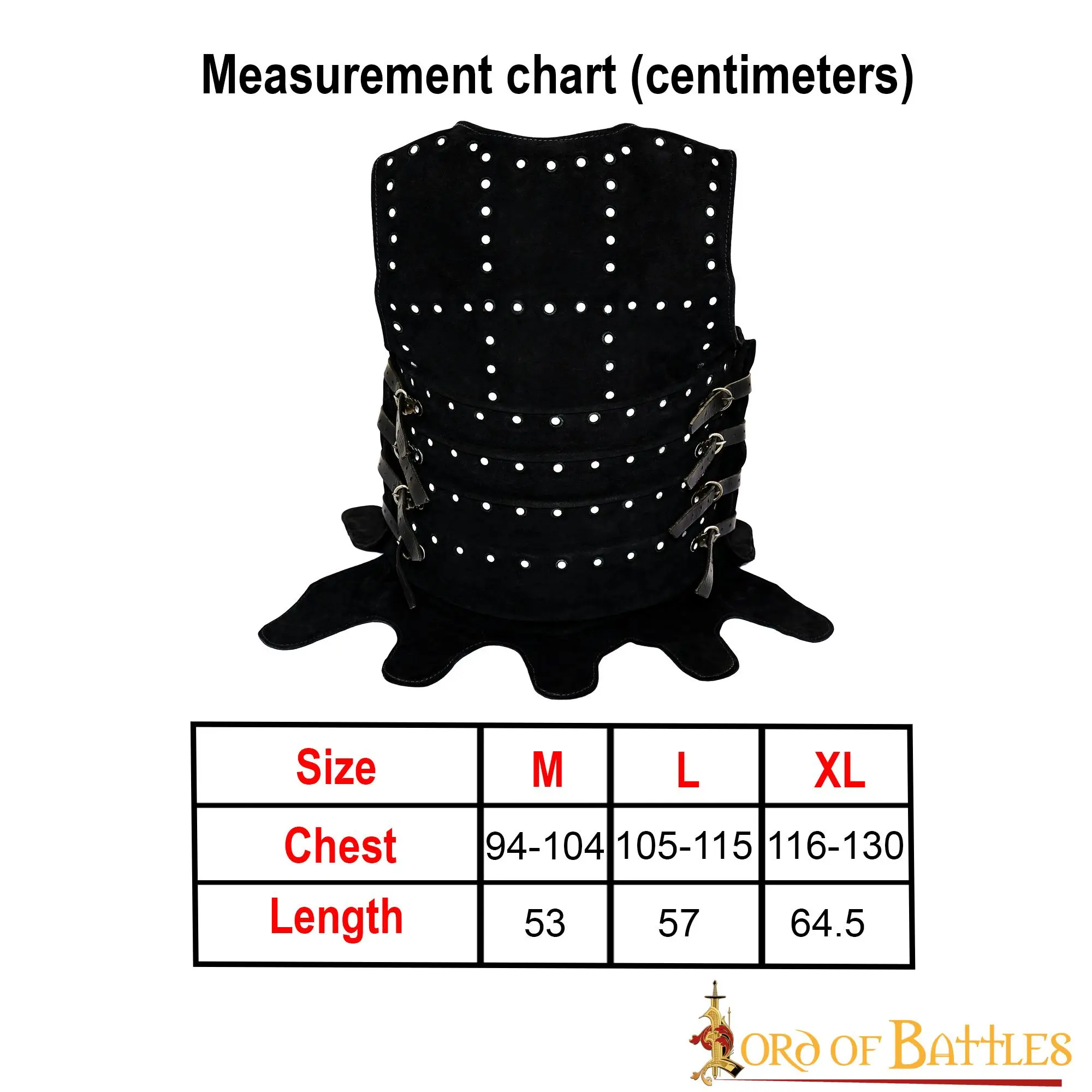 Our protection is made of 20-gauge STEEL plates, carefully riveted on the inner surface of ROBUST GENUINE SUEDE LEATHER, the shape of which is directly inspired by original representation from 14th century, Bavaria. It is easily adjustable for your body shape, thanks to its different sizes AVAILABLE and the carefully placed leather straps on the sides that allow you to adjust it, depending on the type of gambeson you are using. You will appreciate the sturdy leather at the shoulder that allows you to directly lace your pauldrons to your brigandine in the most efficient way.