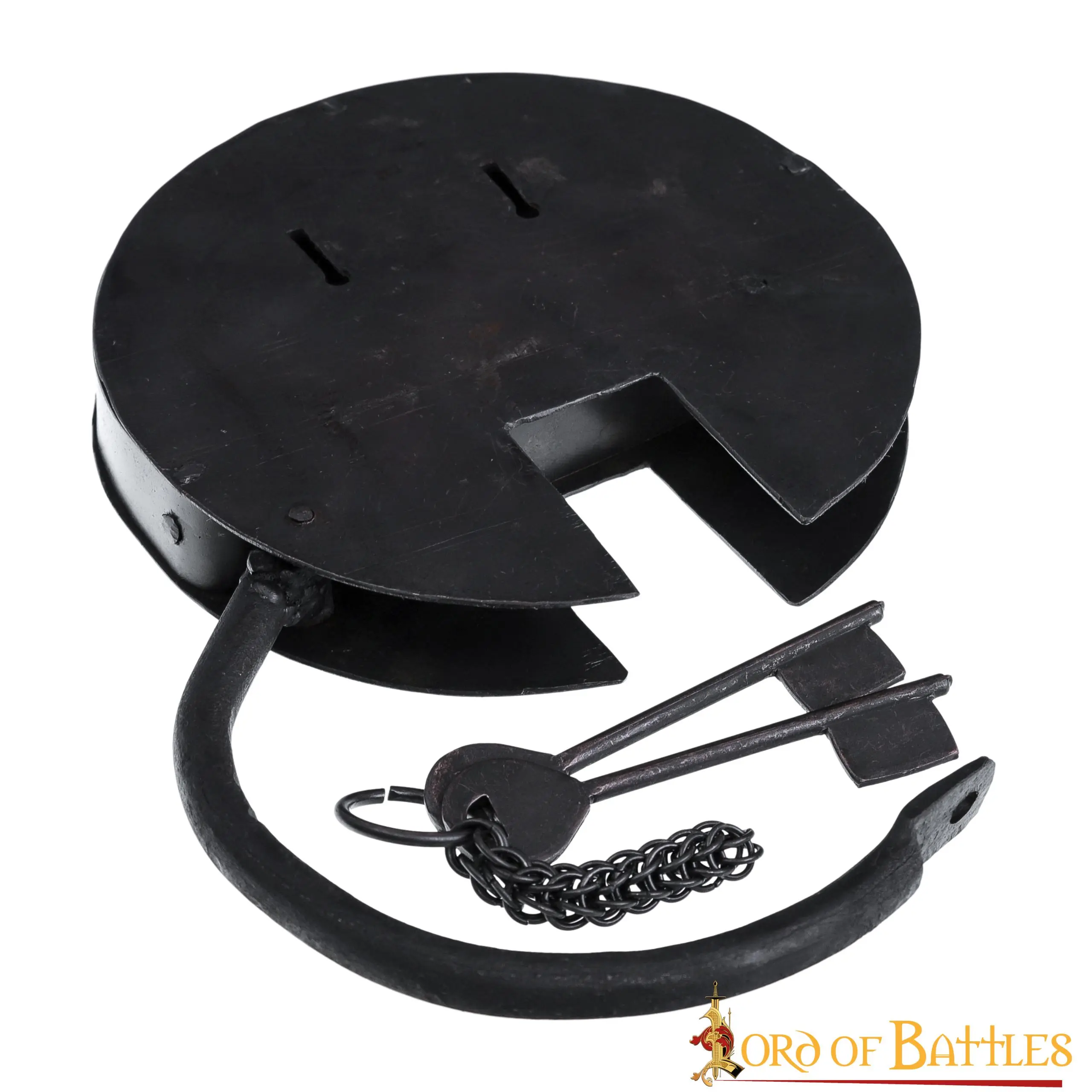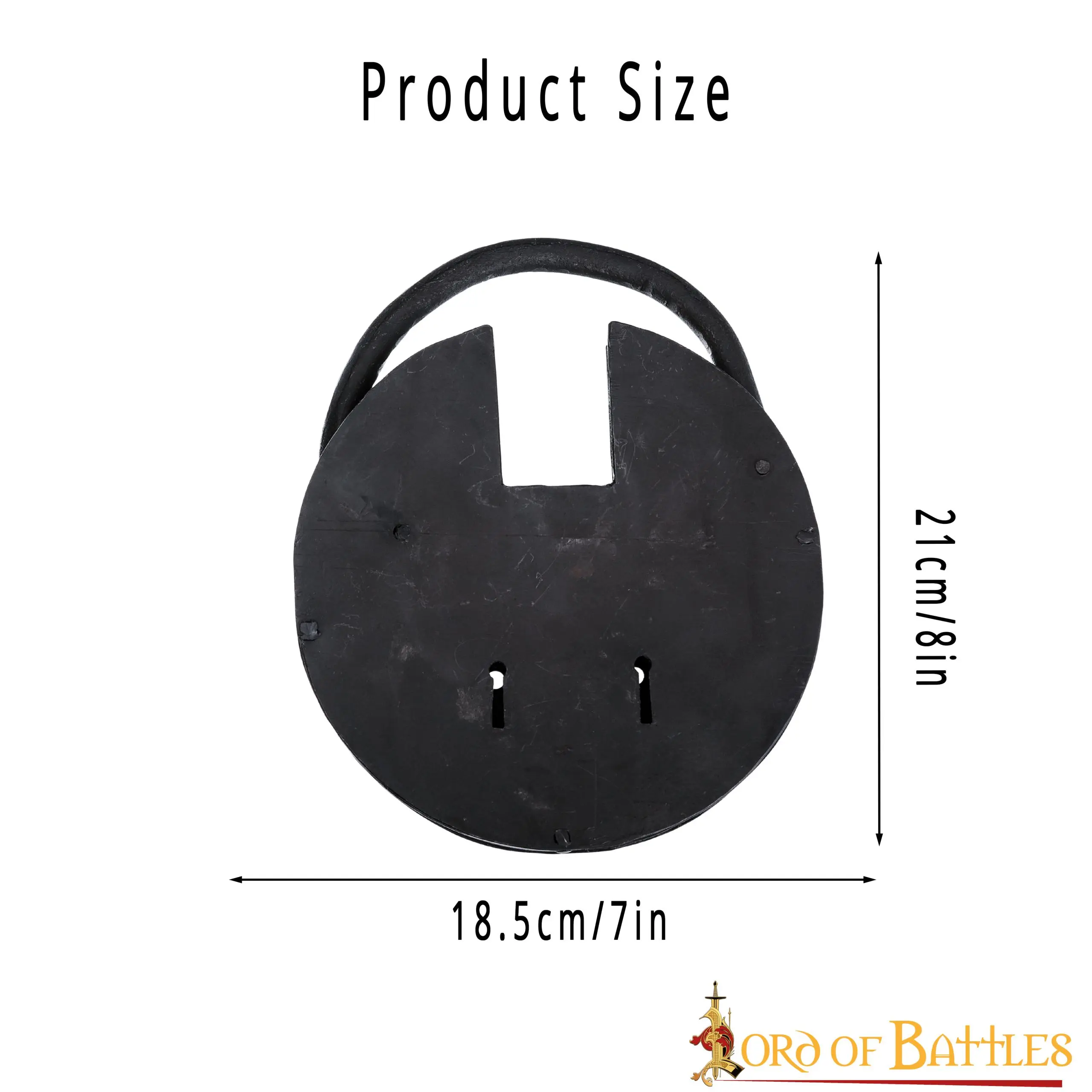 It is HAND FORGED from tough IRON for that rugged medieval look. A set of two keys are provided with this lock, attached to a chainmail keychain. Its total dimensions are (21 X 18.5) cm. This can fit your contemporary settings as well. It can be used for doors, chests, trunks, gates, etc