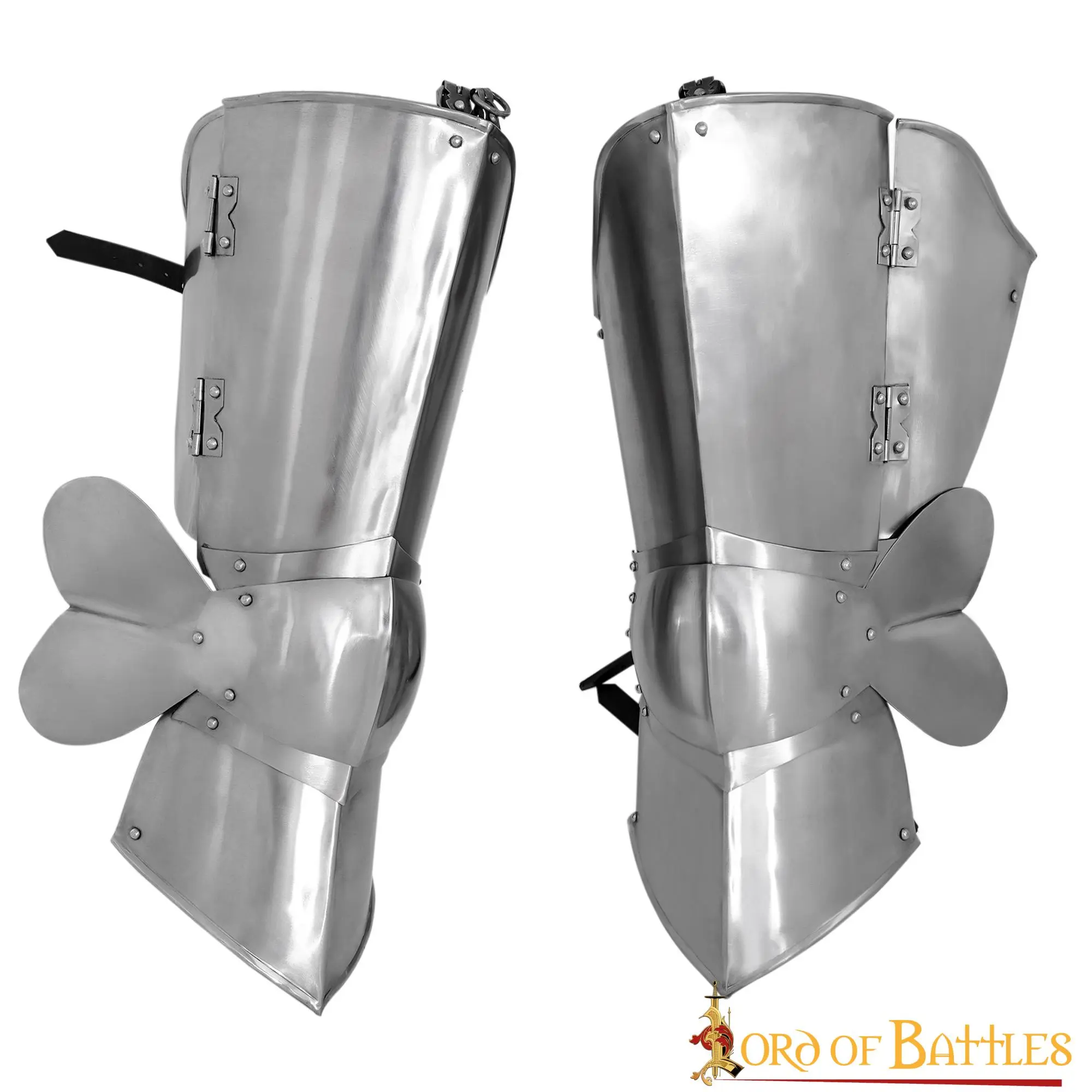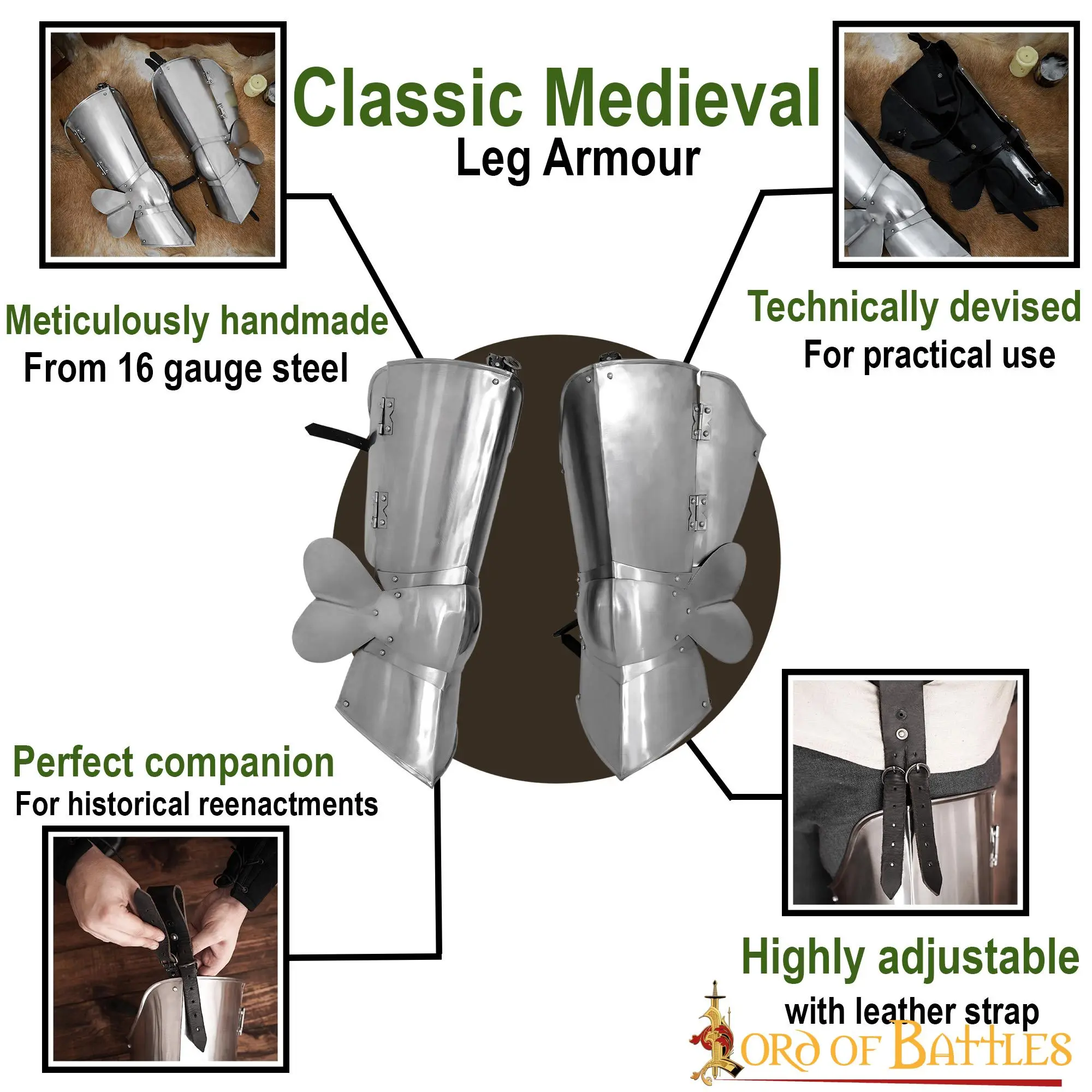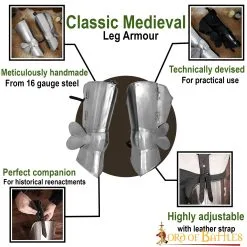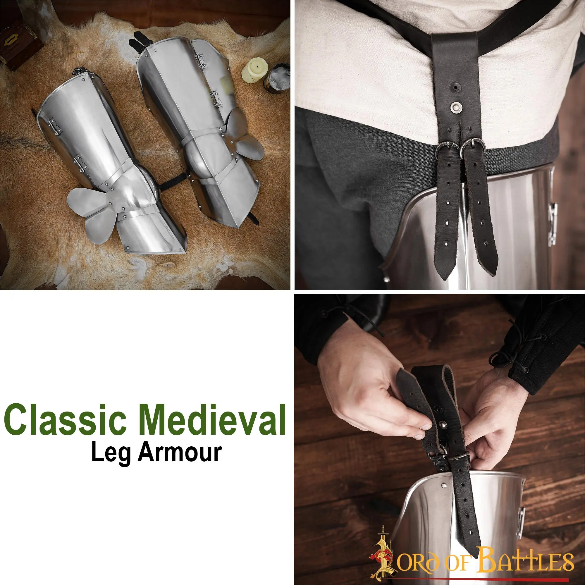 Several ROBUST GENUINE LEATHER STRAPS help conveniently fasten your legs’ armour in place. Just don’t forget to also properly buckle them to your belt, and you will be ready to vanquish your foes!