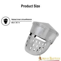 An invincible knightly sword stays firmly held in your mail-clad fist, and your banner floats in the wind while your squire buckles your sturdy 13th Century Crusader Knight helm for battle. The punched face plate makes ventilation easy while fighting your foe and protects you from arrows raining on you and your fellow knights, awaiting the order to charge! Directly inspired by an original seal from the British Museum, we have taken the liberty to slightly modify its ventilation holes to make it the perfect crusader helm!