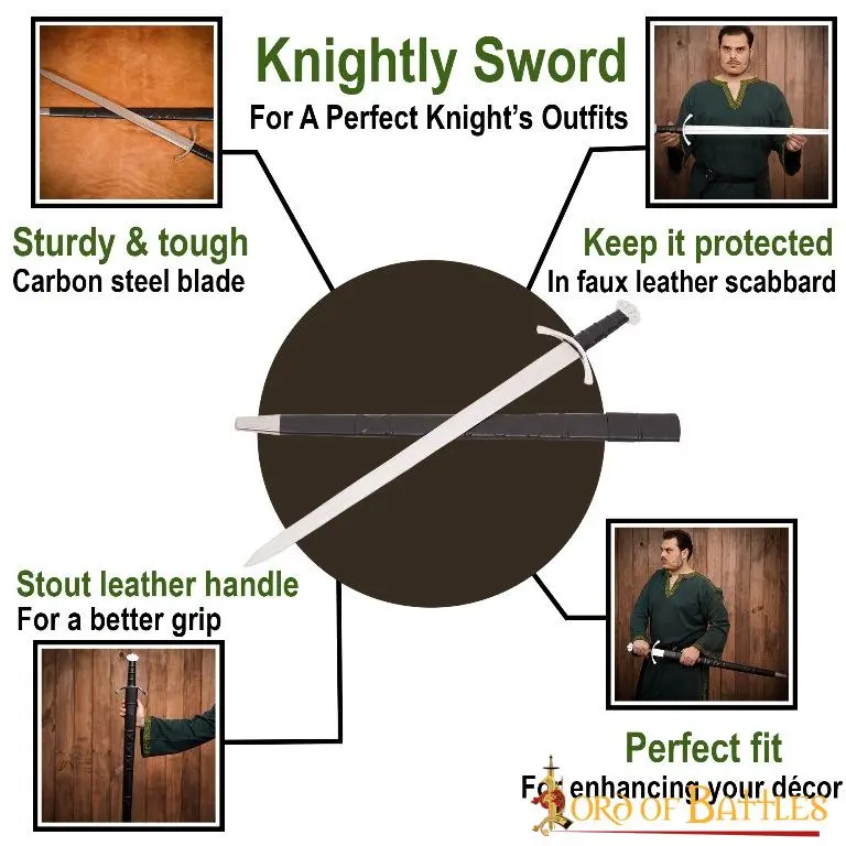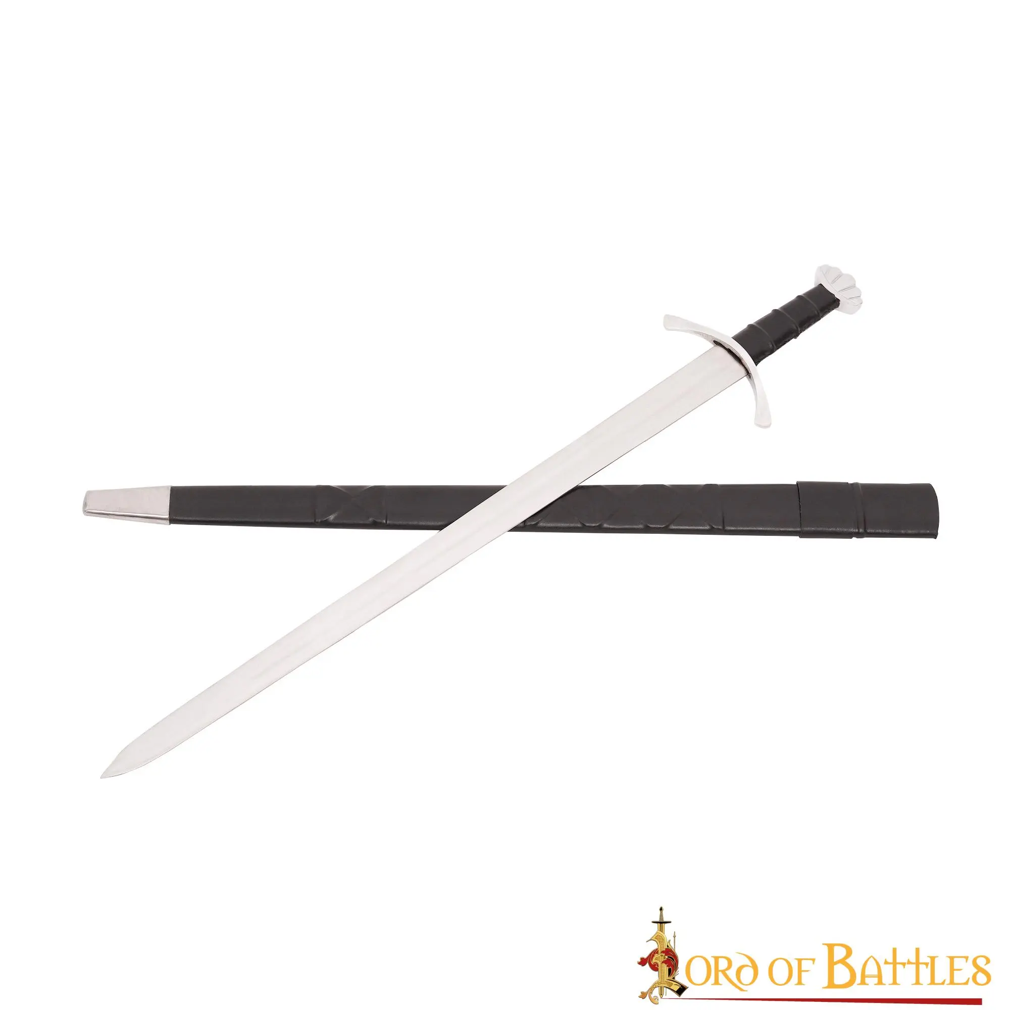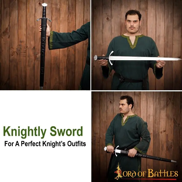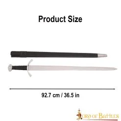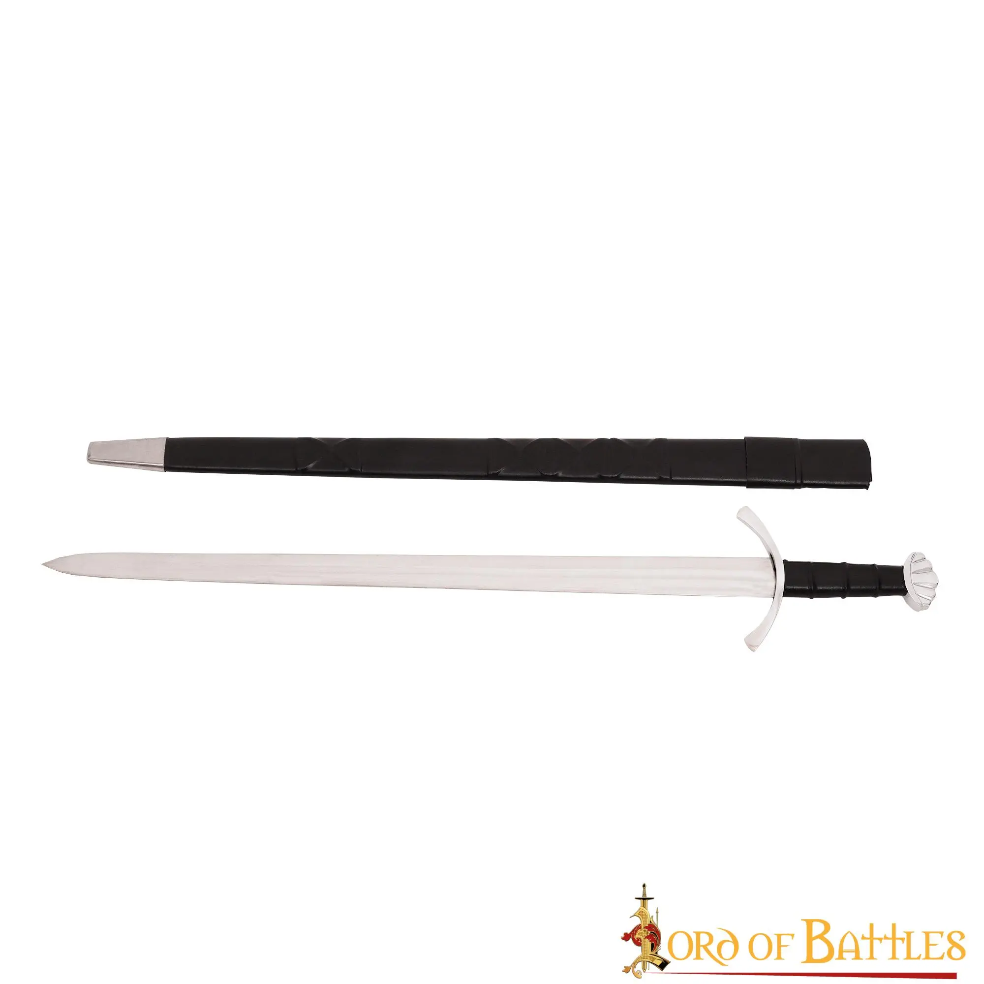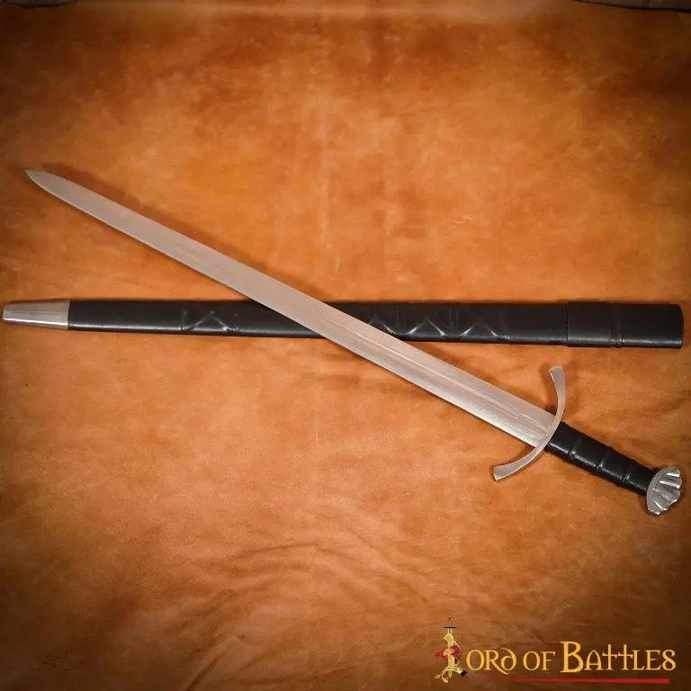 This sword is distinctively used in re-enactments and decorative purposes. The blade is made of tough mild steel, offering longevity. Its total length (including the handle and pommel) is approx. 36.5 inches. It comes with a faux leather scabbard which will keep the blade safe and protected for a long time. The steel pommel is five-lobed, ensuring a Viking front.
