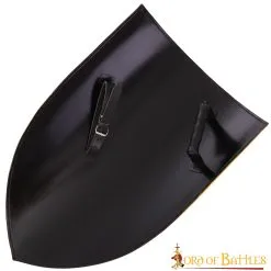 The (28 X 20) inches shield is handmade from sturdy 18 gauge MILD STEEL. This shield comes with a metal handle reinforced with a wooden cover for a better grip and a genuine leather strap for an adjustable fit while held for your next Reenactment or LARP costume!