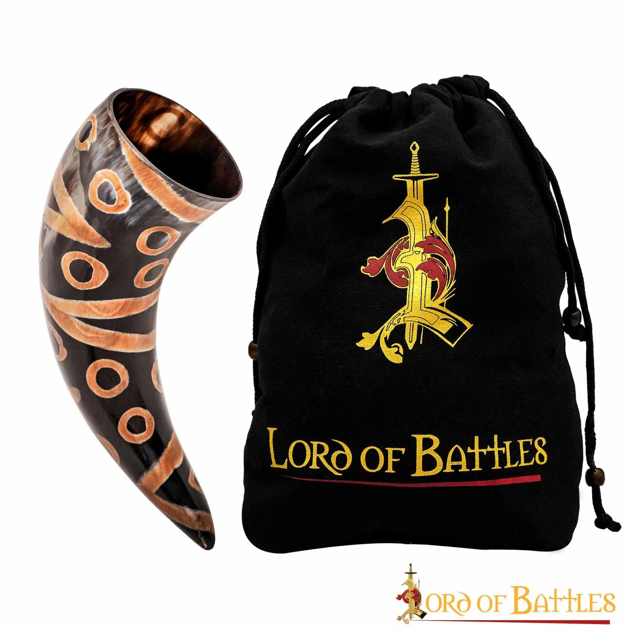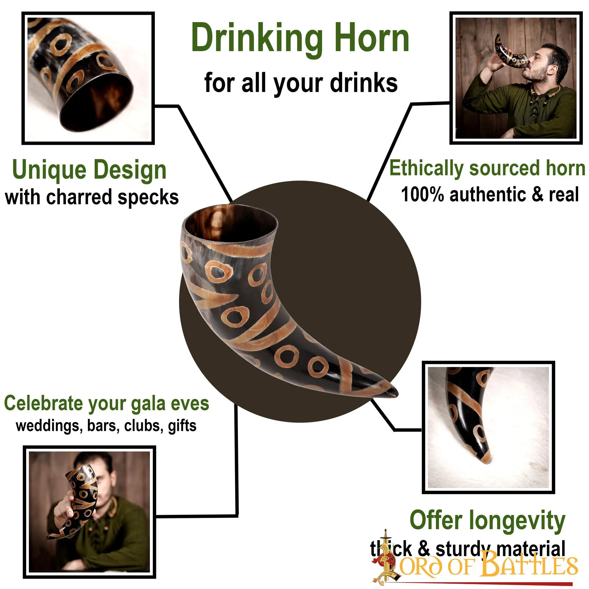 Raise your toasts to yet another victorious battle with our Medieval Drinking Horn, handmade from ethically sourced Bovine horn, embellished with carefully charred specks. Its unique design and visually appealing rugged appearance make it great for gifting it to your loved ones as well! Since it comes with a bag, it can effortlessly be taken care of for years to come!