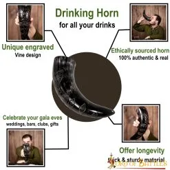Be it glugging ales with your friends or simply adorning your décor, our drinking horn with beautiful vine engraved design is just the right fit. Its unique design and visually appealing appearance make it great for gifting it to your loved ones as well! Since it comes with a bag, it can effortlessly be taken care of for years to come!