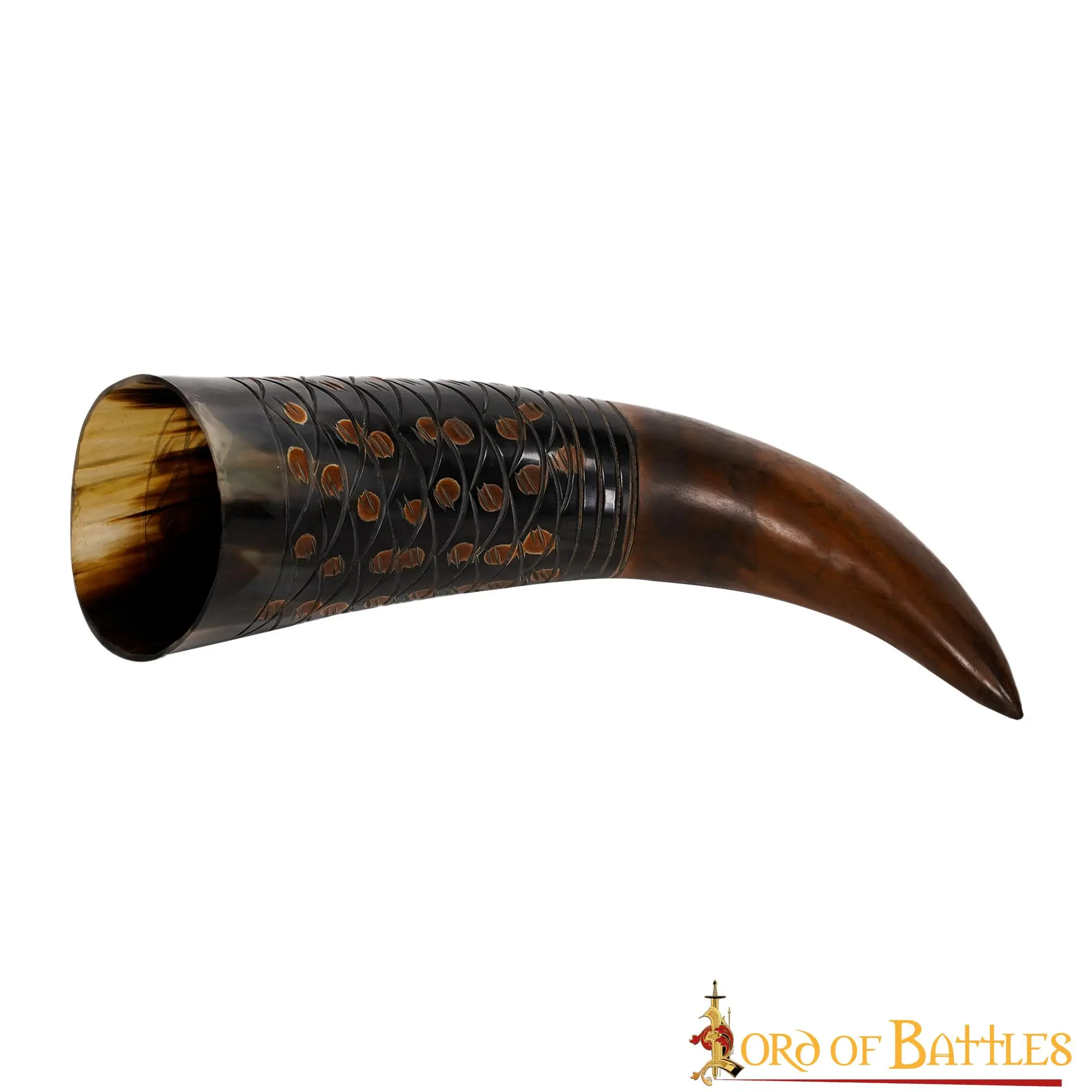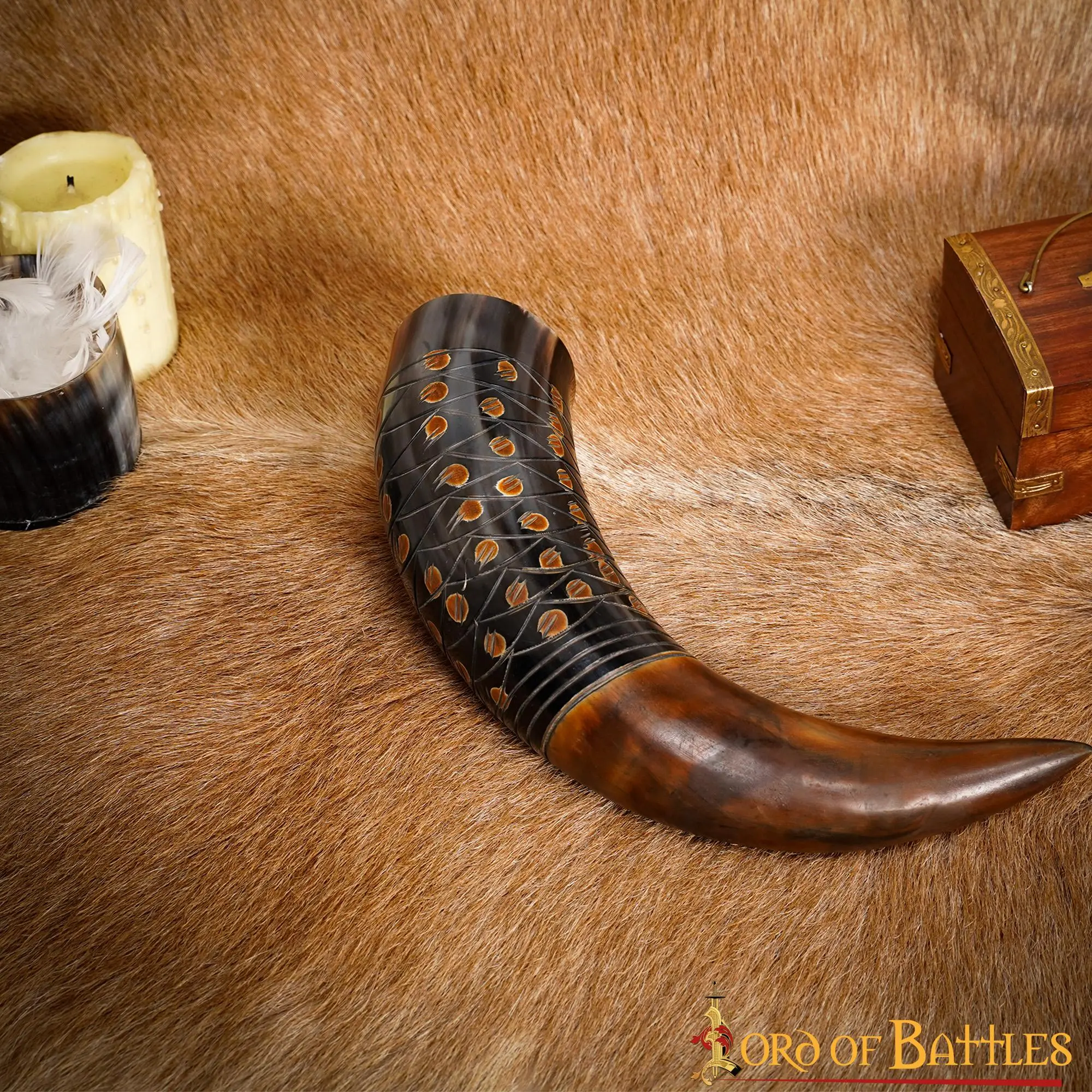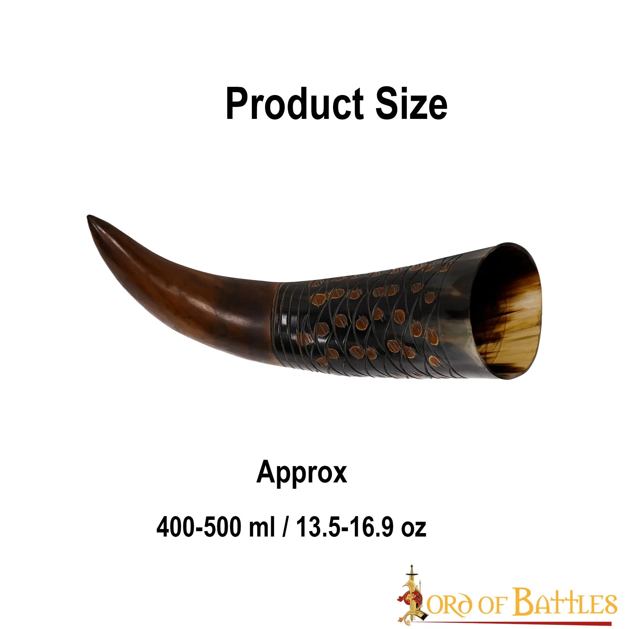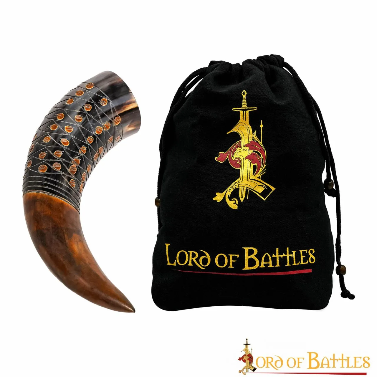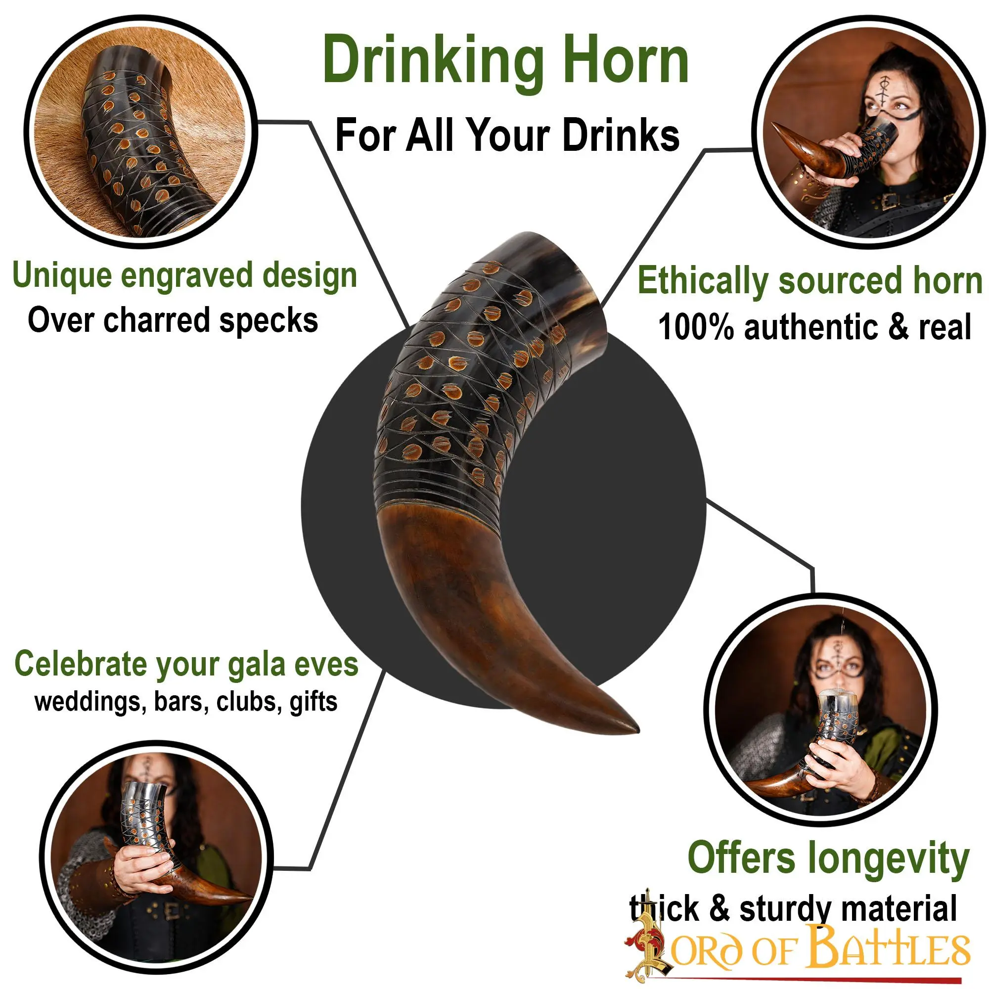 Be it glugging ales with your friends or simply adorning your décor, our drinking horn with engraved patterns over charred specks, is just the right fit! Its unique design and visually appealing rugged appearance make it great for gifting it to your loved ones as well! Since it comes with a bag, it can effortlessly be taken care of for years to come!