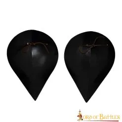 Skilfully handmade from sturdy 16 gauge steel, these pauldrons would surely complement the might of your legendary Viking armour. The elongated teardrop design perfectly covers the shoulders, and its lengthened structure sparsely protects the upper arms by ensuring that a bit of steel is present to prevent a cut. For fastening it to your armour, a set of robust GENUINE LEATHER STRINGS are provided along with this set of pauldrons.