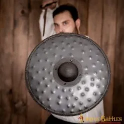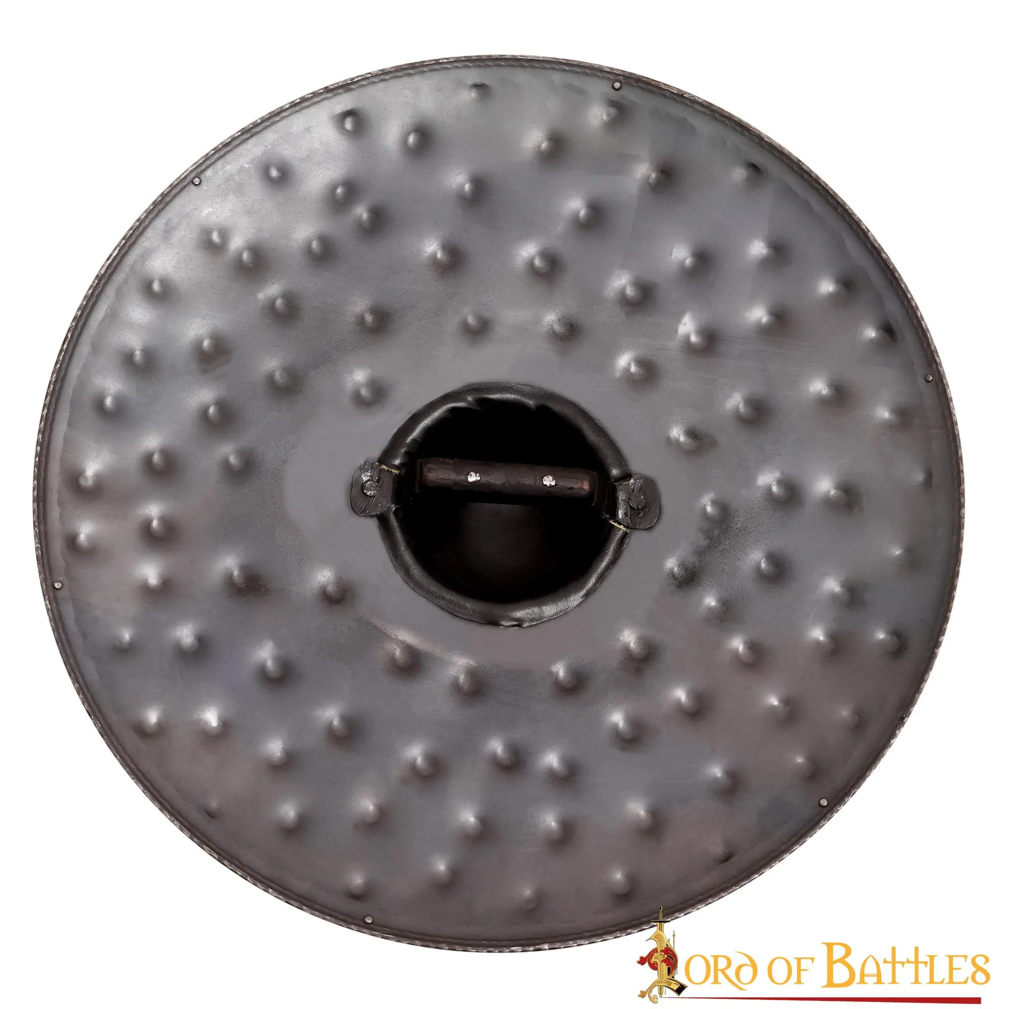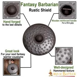 Our fantasy barbarian shield, with a diameter of approx. 22 inches is skilfully HAND FORGED from sturdy 16 gauge mild steel with an attractive hammered texture. For better shock-absorbing and firm grip, this shield comes with a steel handle, reinforced with wood. The umbo riveted at its centre supports a great thrusting force to inflict on your opponent. This shield is FULLY-FUNCTIONAL and a perfect fit for a barbarian character.