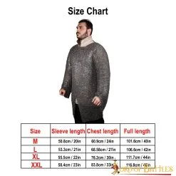 This hauberk is intricately HANDMADE from 17 gauge mild steel rings with a diameter of approximately 9 mm each, riveted using DOME RIVETS. For increased strength, the rings alternate with SOLID FLAT RINGS. This comes in medium, large, extra large, and double extra large sizes for you to pick a perfect fit for yourself.