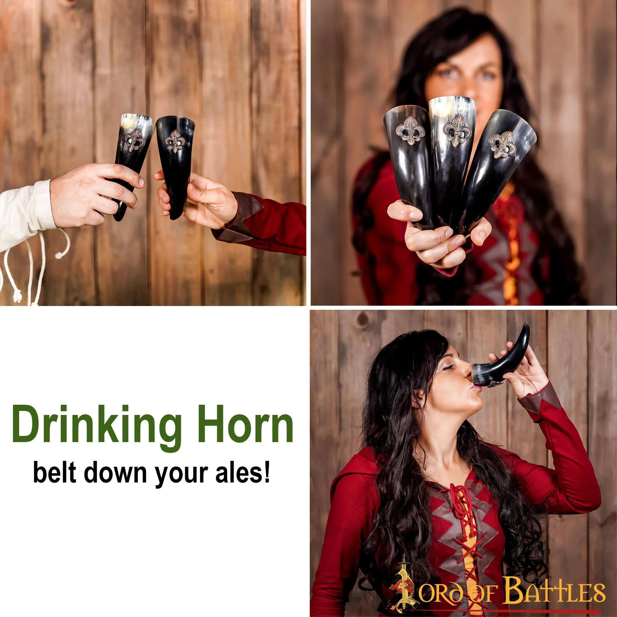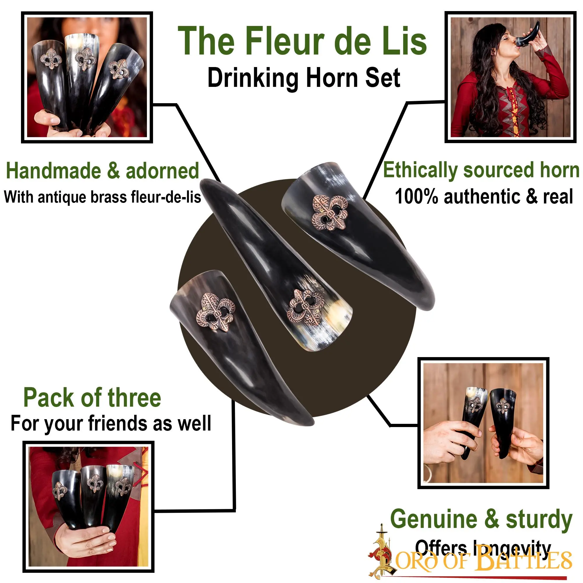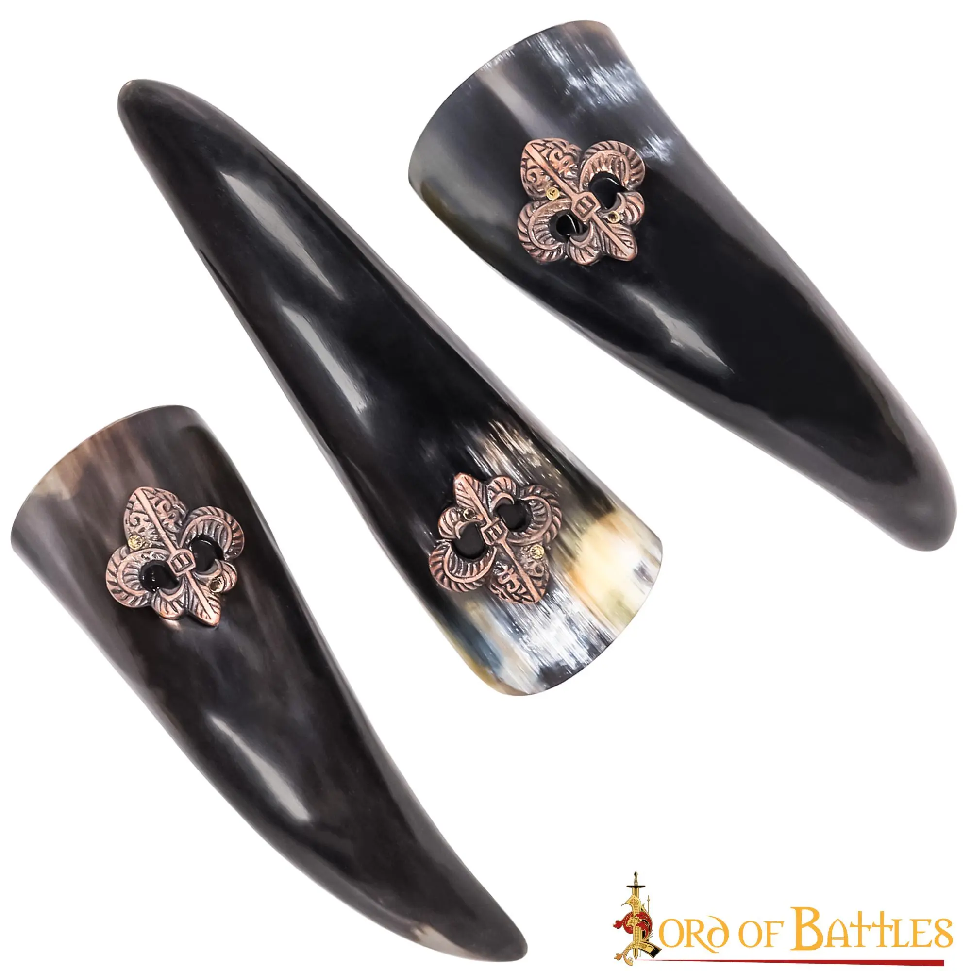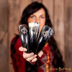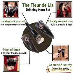 Are you and your trio looking for something to blend with your medieval fantasy spirits? You should definitely consider our medieval set of small drinking horns! The Fleur de Lis decorations on each horn are precisely what make them stand out! And for you to keep this set of natural products safe and protected, we provide a sturdy canvas bag to put it in.