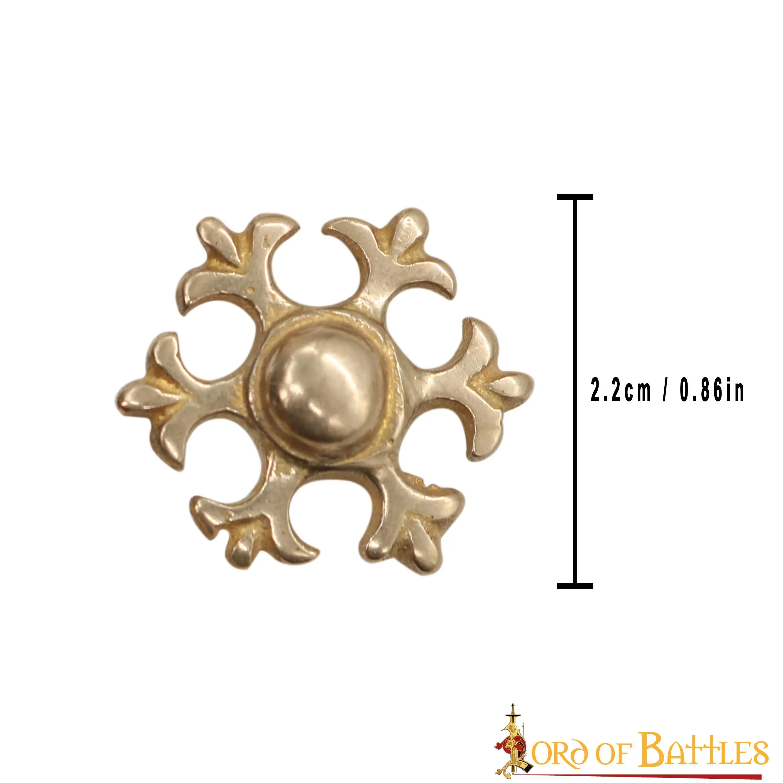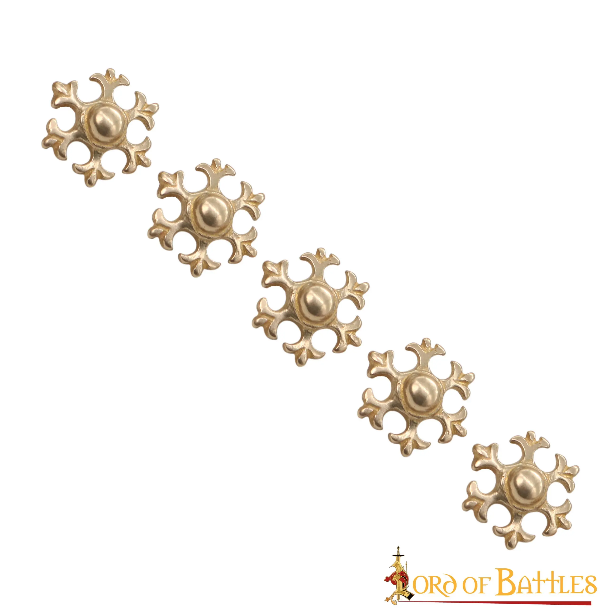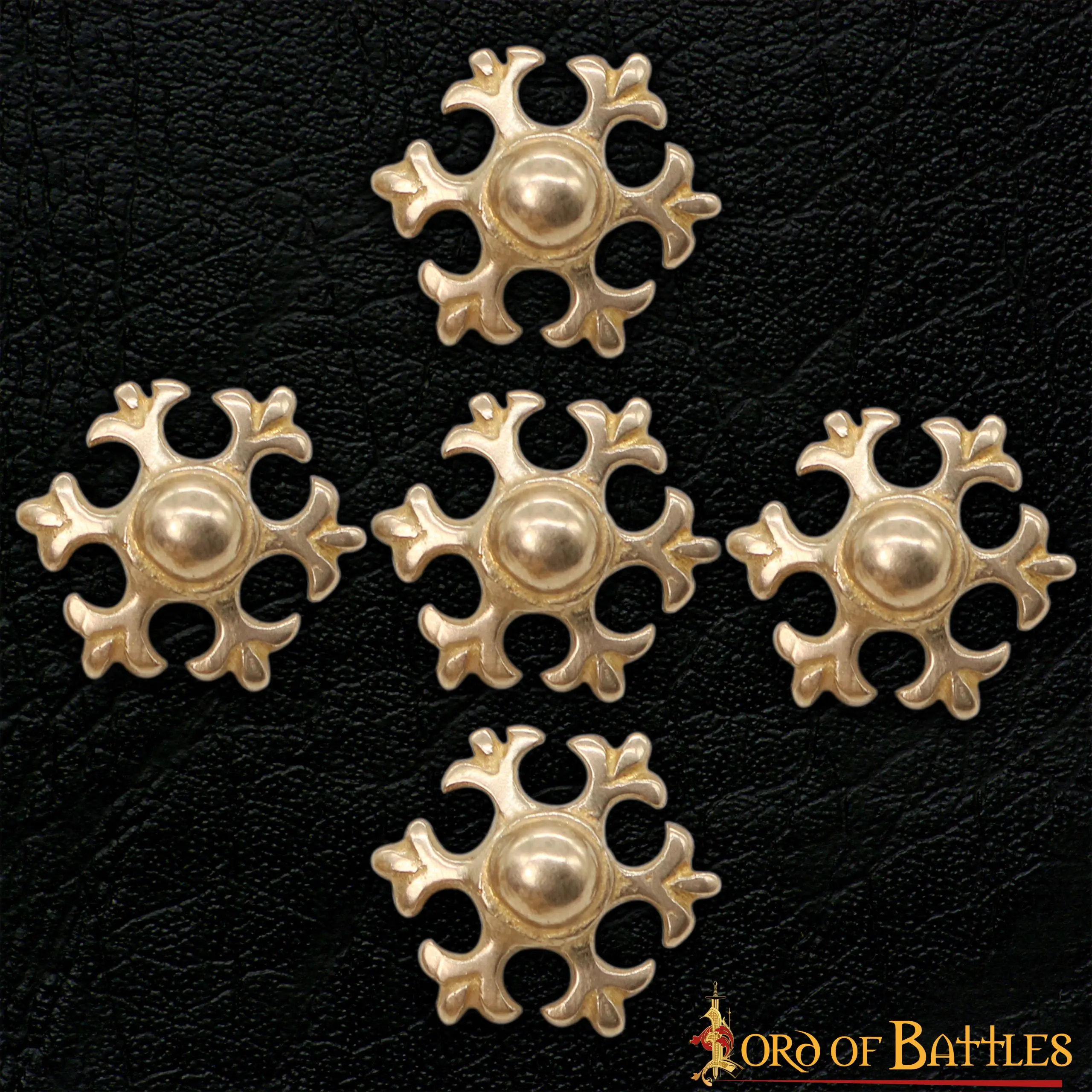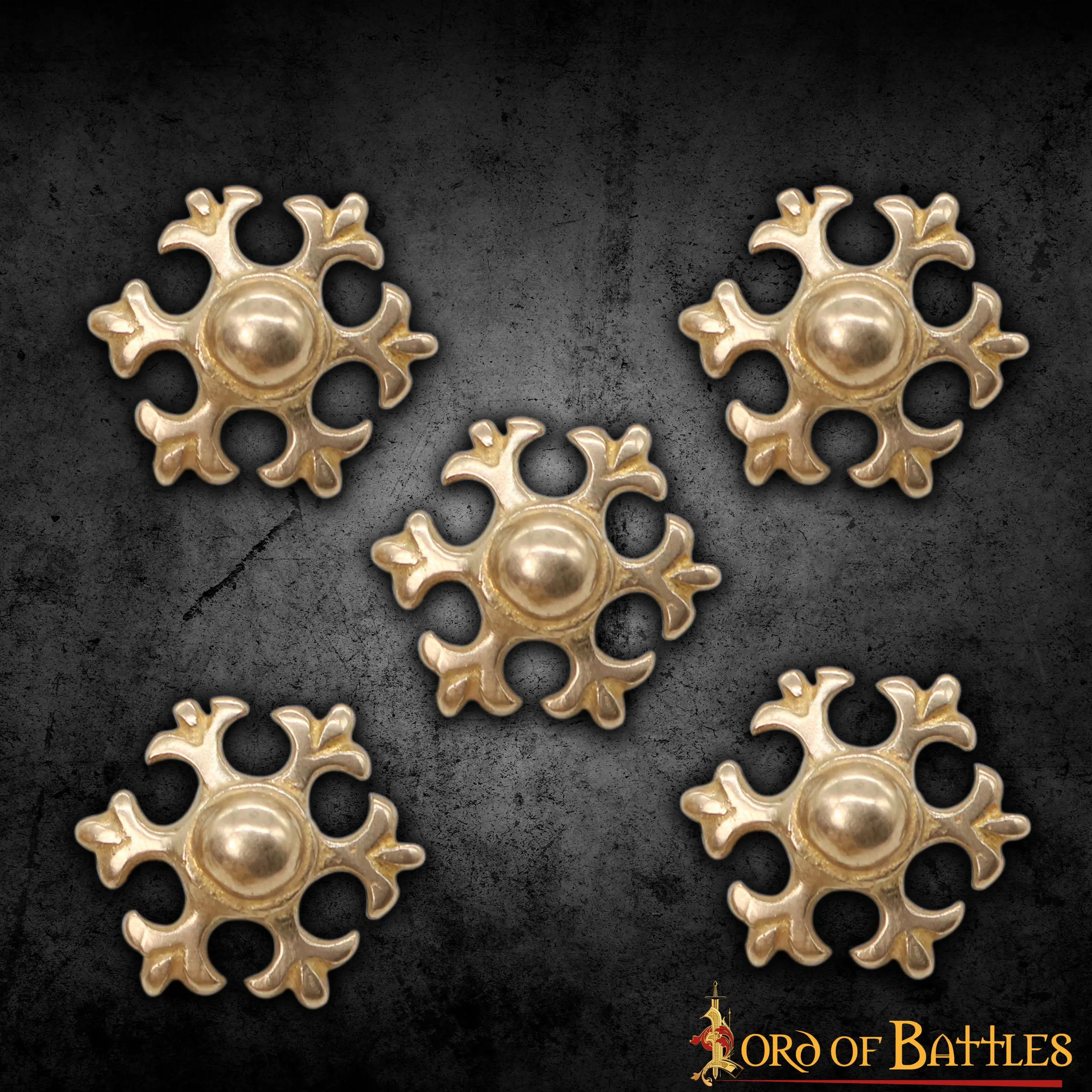 Tired of those mundane leathercrafts and feel like adding the missing flair to them? These fleur brass mounts/adornments should do the trick! These, when added to your apparel, belts, bags, or pouches, will make your outfit stand out in your next LARP or reenactment event!