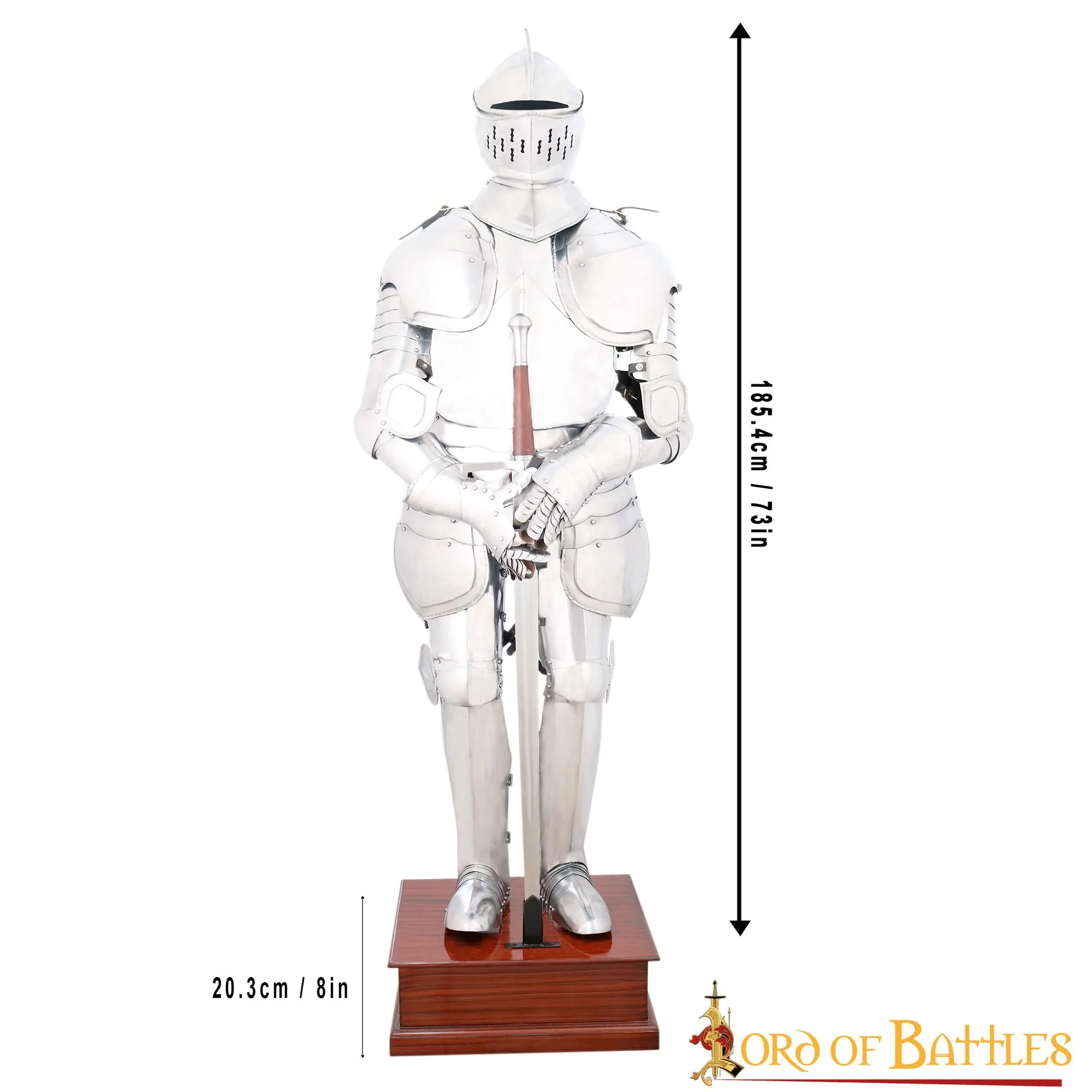 All the components of this suit of armour are handmade from 18 gauge mild steel, hence sturdy and lightweight. Its total height is approx. 73 inches and comes with a polished finish. The armour stand is attached to a wooden base that holds the entire suit of armour in place.