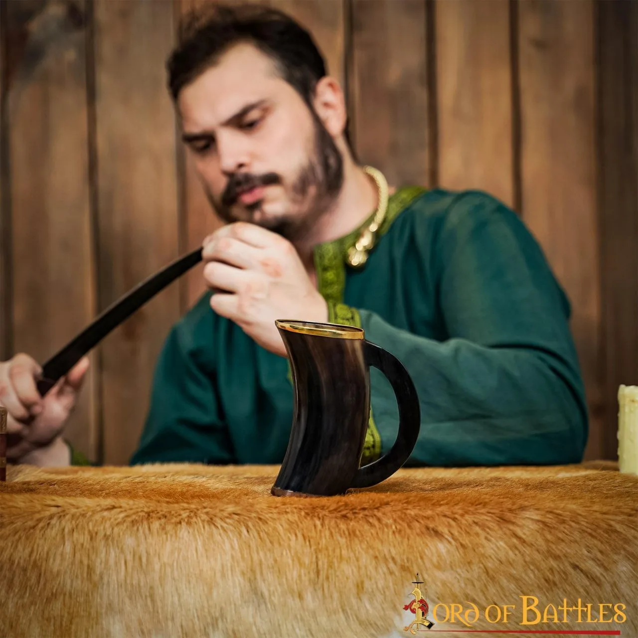 Still feel like you are missing something to feel like a true Viking warrior? We know that our medieval beer mug will suit you best! Because it is not just any horn mug. It is our AUTHENTIC DRINKING HORN mug, made for the halls of Valhalla or even the splendid Viking feasts. Adding to its elegant look is a PURE BRASS detail on the rim of this natural horn cup. We care for your horn products as much as you do, and just for that, it comes in a robust cotton canvas bag.