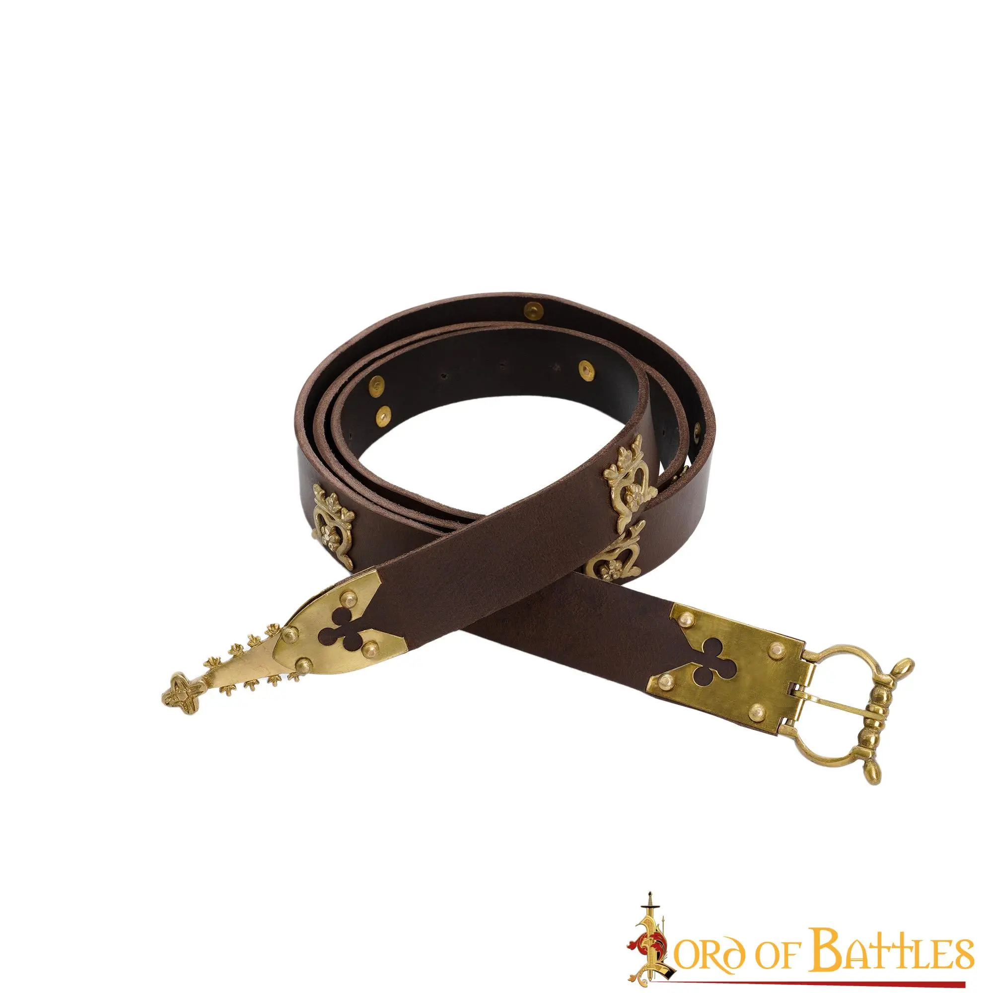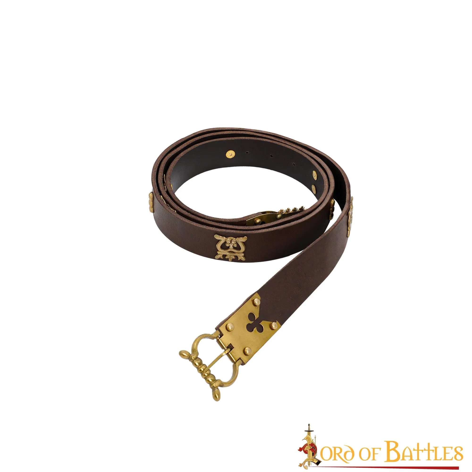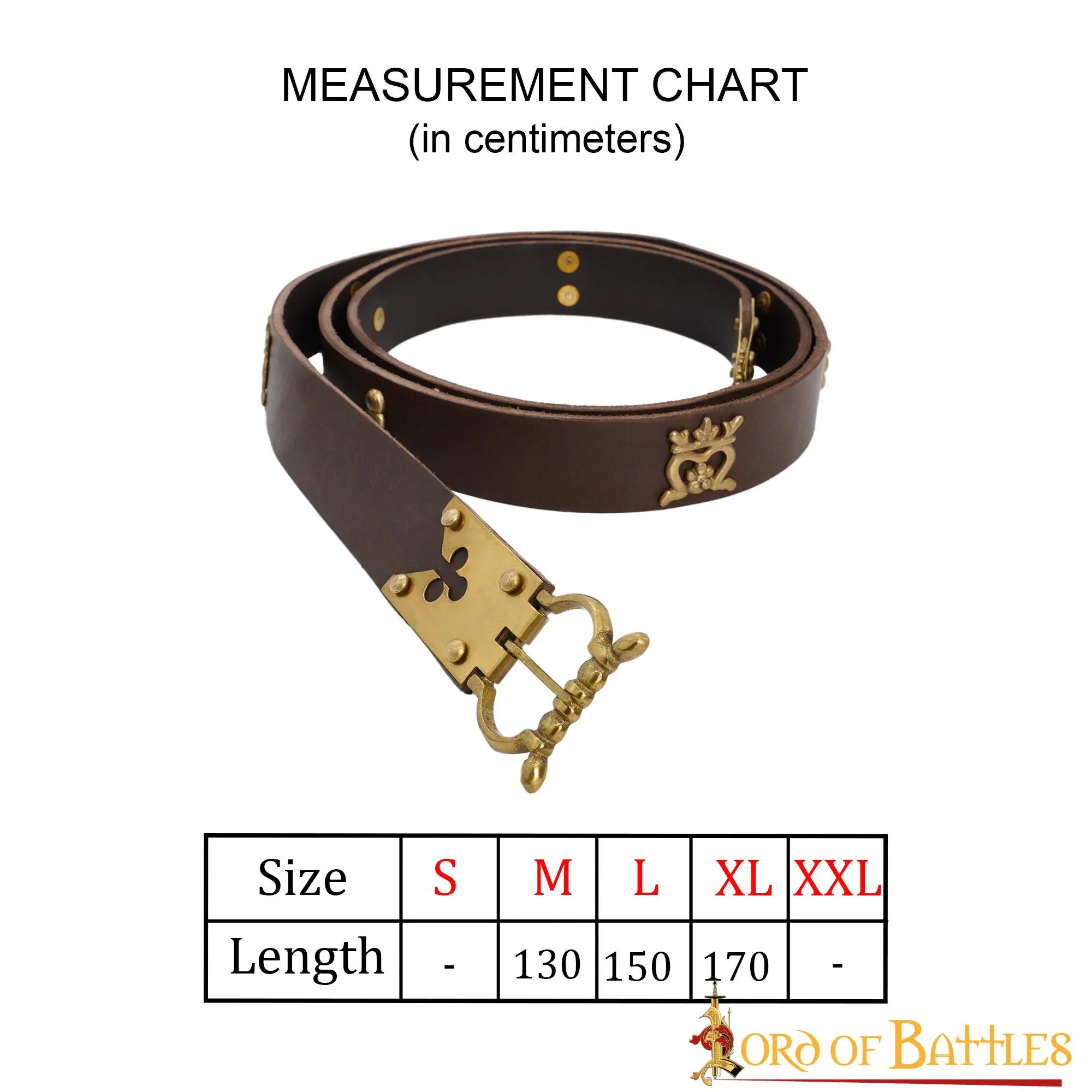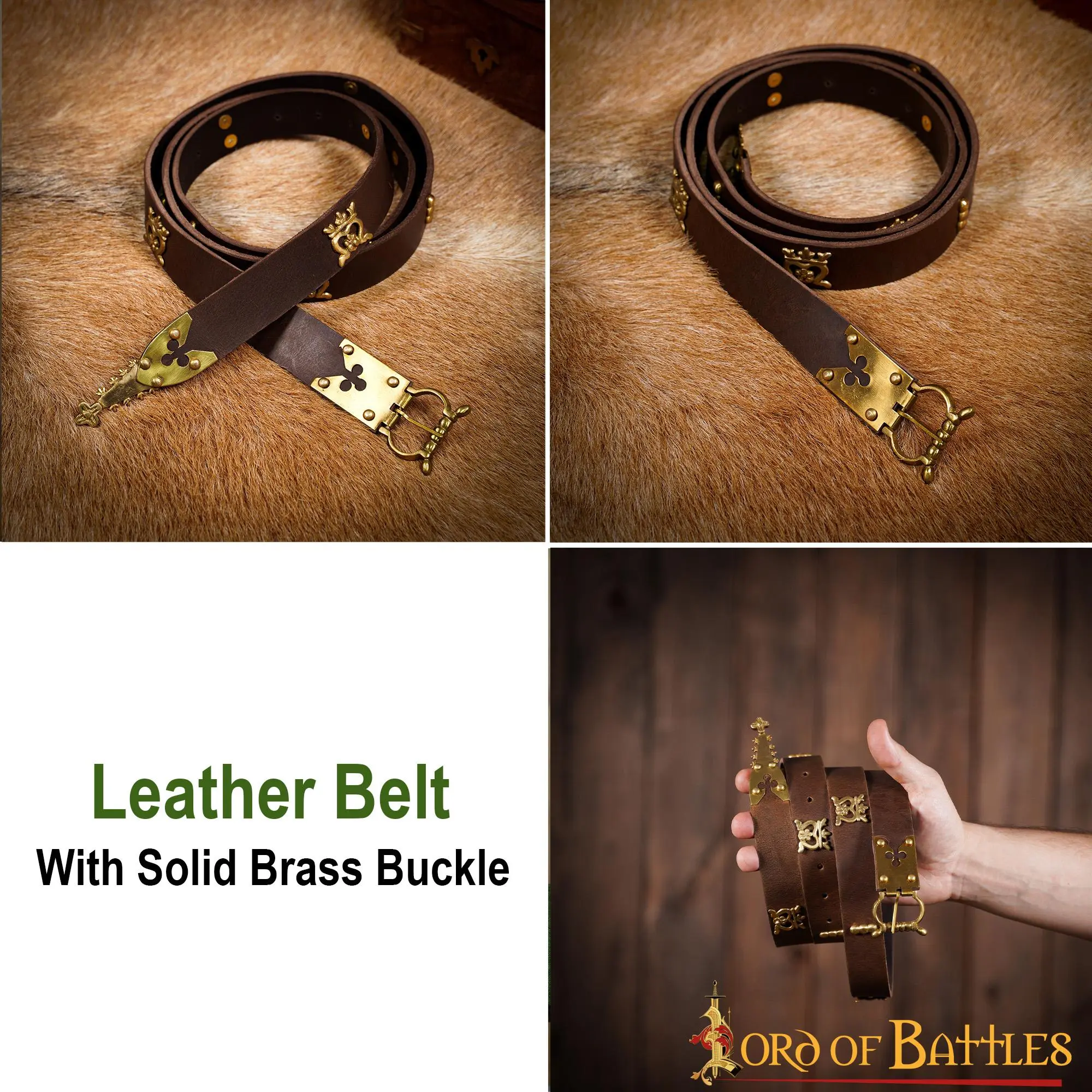 Adorned with elite crown mounts, a trefoil buckle and chape, all crafted from PURE SOLID BRASS make a rich leather strap, even more medieval. HANDCRAFTED from ETHICALLY SOURCED LEATHER (3-3.3 mm thickness), it shall show no signs of wrinkles in the nearest time. It is available in 130 cm, 150 cm and 170 cm lengths for you to pick the right fit for yourself. NOTE: Since this is authentic buff leather, make sure to keep it away from moisture; clean it regularly with linen (or any soft cloth); if the stain pertains, damp cloth and some lather out of mild soap will do the needful.