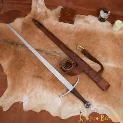 This sword is skillfully HAND FORGED from tough CARBON STEEL that comes dull for reenactor’s use. The total length of this sword (including the handle and pommel) is approx. 37 inches. A protective GENUINE LEATHER scabbard and belt are provided with this sword that enhances its portability. This is a fully functional sword that can be sharpened for REAL LIFE combat as well.