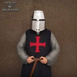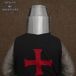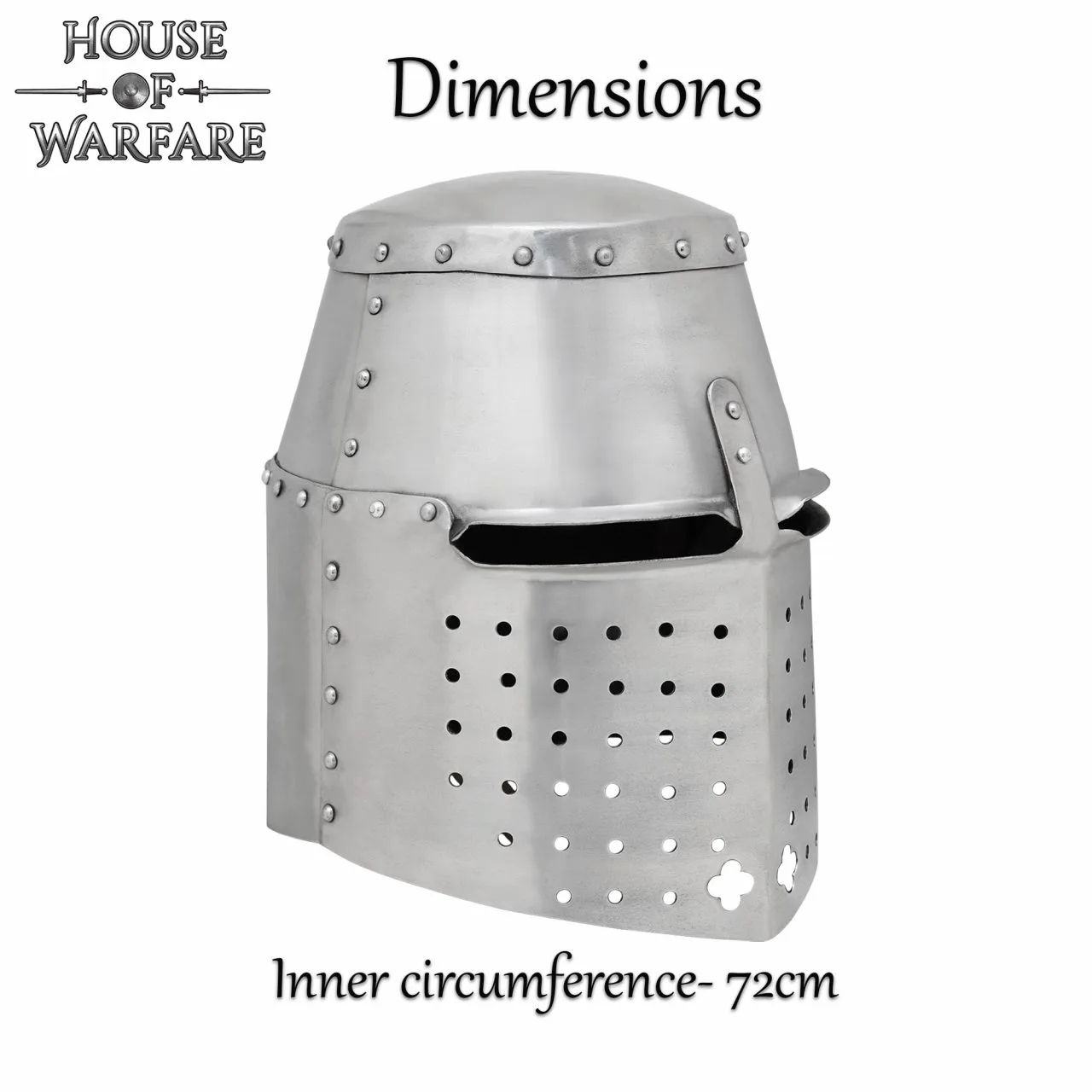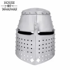 Looking forward to portraying a fearsome medieval knight with this helm donned on top of your reliable armour? Our flat-top great helm has got you covered! The original of this helm belonged to Sir Richard Pembridge. It was created to be worn on top of a Bascinet or Cervelliere, which was common practice for knights during that era. However, our replica has been specifically designed to be worn directly on your head and features interior padding that provides protection from blows and ensures stability.