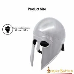 Our Corinthian helmet, handmade from 18 gauge mild steel, is lined with a comfortable and secure leather liner. A circumference of approximately 68 cm (without liner) makes it fit almost all head sizes (65 cm with liner). The height is about 31 cm and the width (from front to back) is 27.5 cm. The gap just below the nasal plate is 3 cm and eye slits measure about (6×3.2)cm. A sturdy chin strap closed with a brass buckle will help keep your helmet in place during all your battle. Note: This product is carefully coated with a layer of oil when packaged that acts as a temporary (protective) layer against corrosion (rust), which can easily be wiped off using any oil remover or even a dry cloth.