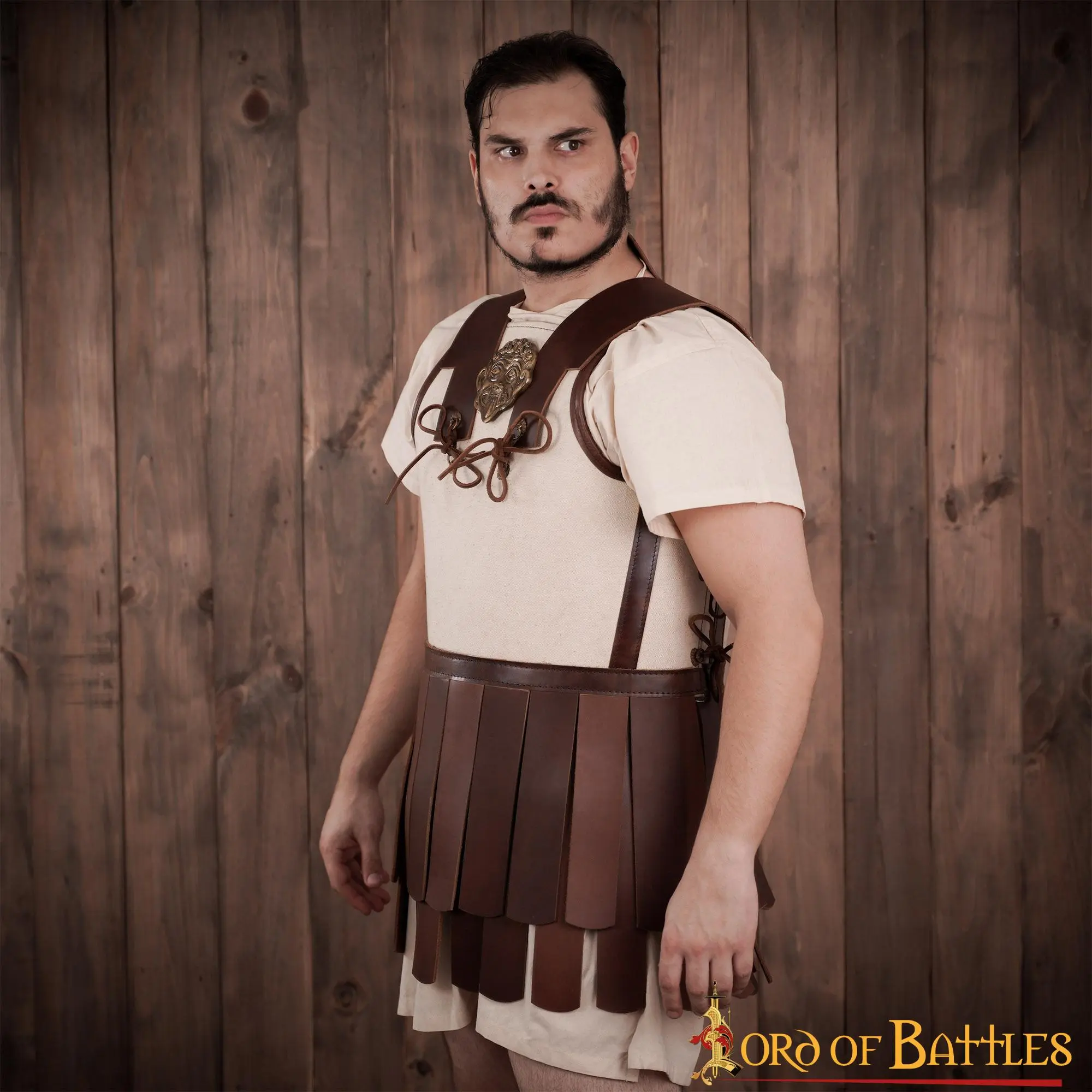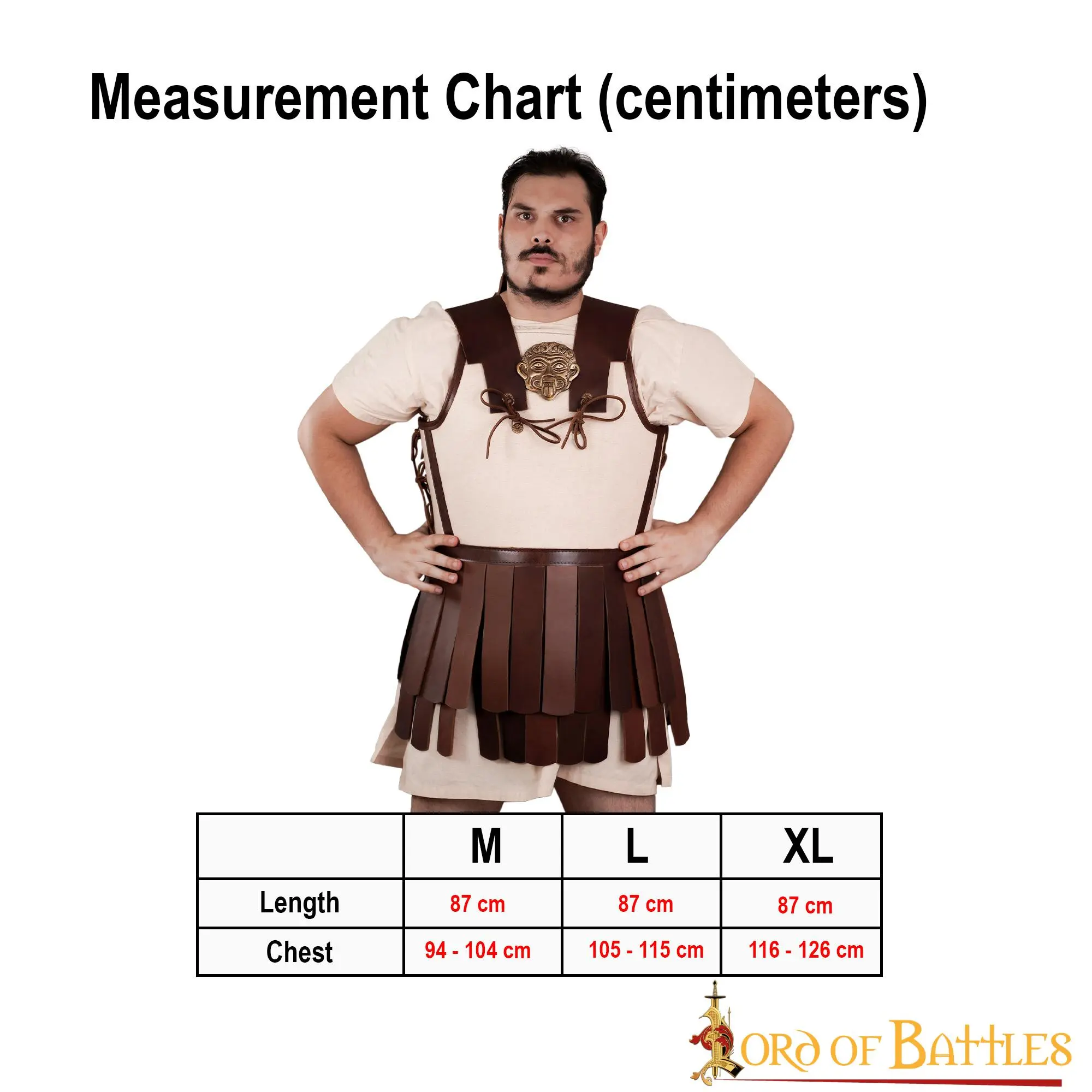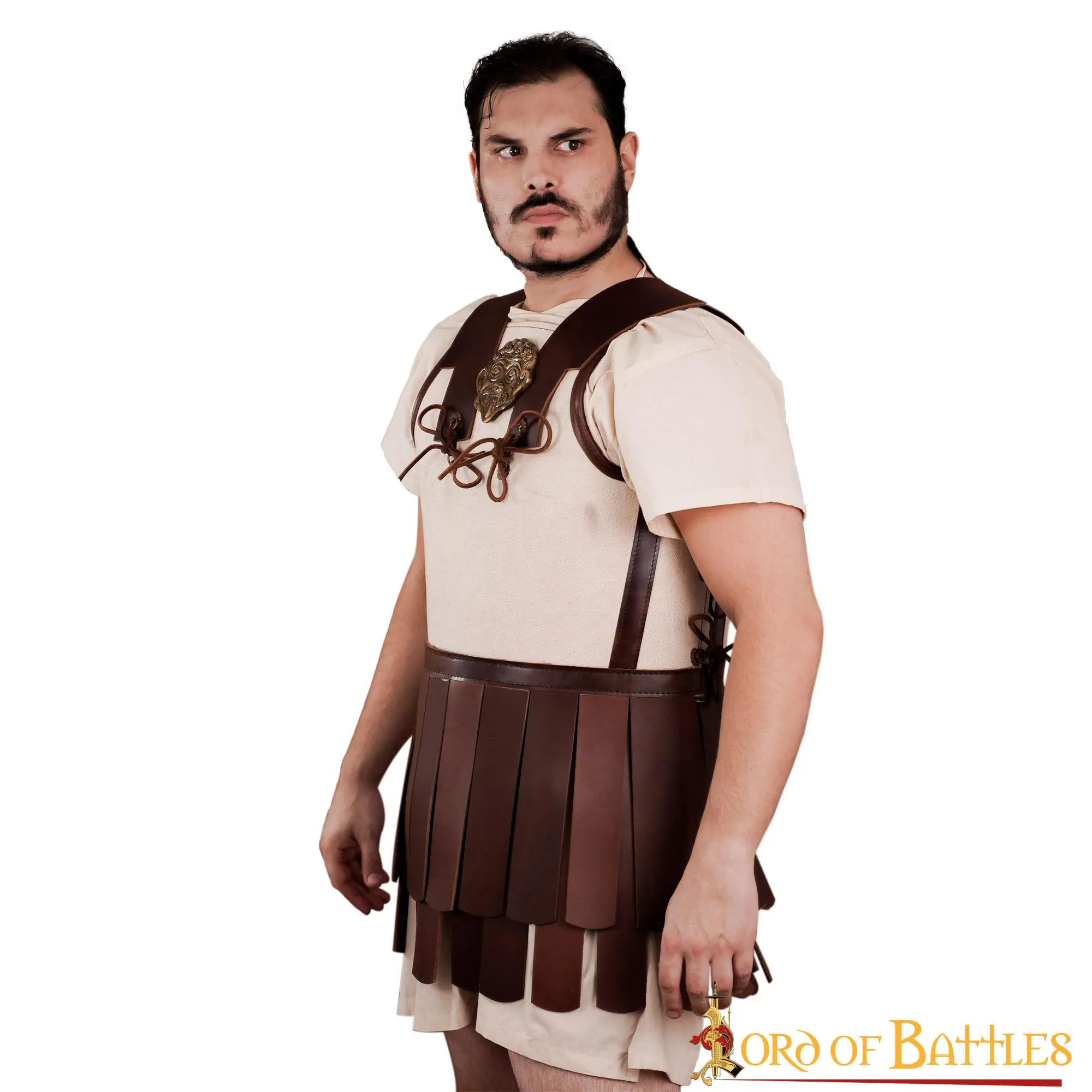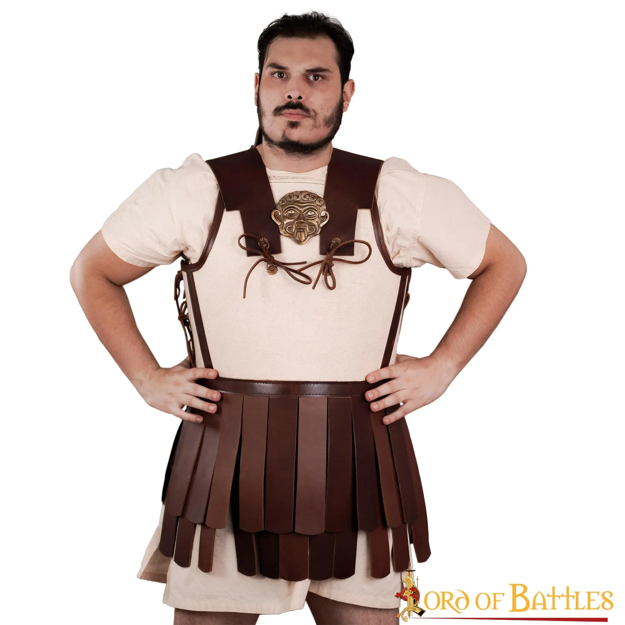 Painstakingly HANDCRAFTED from GENUINE LEATHER and ROBUST CANVAS, it is lighter and less prone to over-heating its wearer than contemporary bronze muscled cuirass. The long and sturdy leather pteruges hanging by the lower part of this linothorax provide additional protection for the groin and upper legs. A Gorgon Medusa antique brass adornment is firmly affixed right at the centre of the torso adding an additional little touch of authenticity to this already impressive armour. Our linothorax is available in three different sizes: Medium, Large and Extra-large. For a detailed size description, consider the chart given with the photographs.
