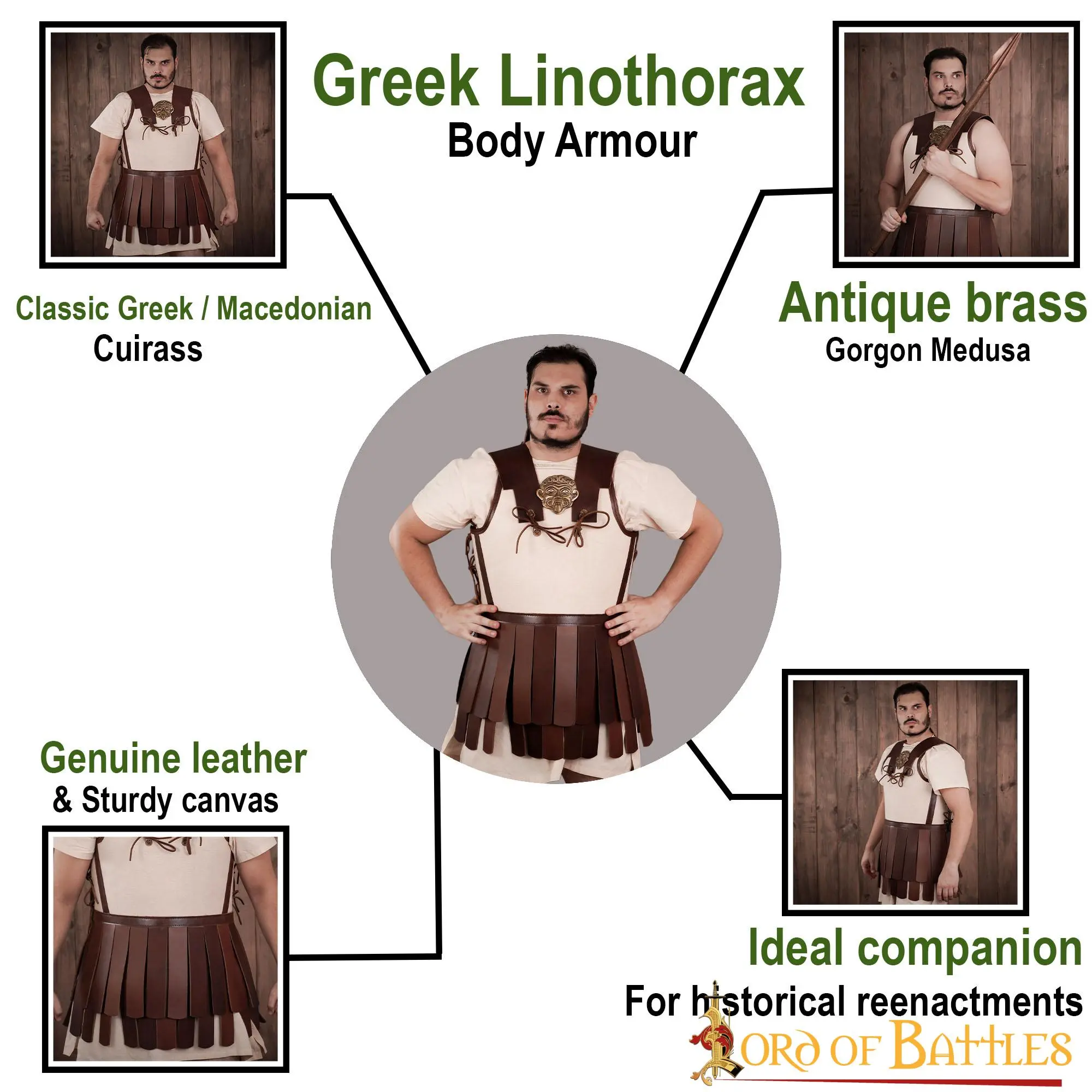 This Linothorax is directly inspired by the glorious armour of Greek Hoplites of Athens and Sparta fighting the Persians or fighting each other during the Peloponnesian War. Later on, it was also worn by the famous Phalangists of Alexander ‘The Great’ army and by many members of his elite companion shock cavalry. This direct inspiration from the rich ancient history makes it a must-have for your personal collection or your next historical reenactment!