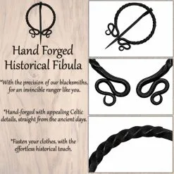This medieval/Celtic fibula is hand-forged from sturdy iron, perfect for your next medieval event, LARP or fantasy costumes. The inner diameter is about 6.5 cm, and the needle is about 11 cm long. While we pack this product, we coat it with a thin layer of oil to avoid corrosion, so don’t forget to wipe it off before you pass it through your favourite piece of apparel.