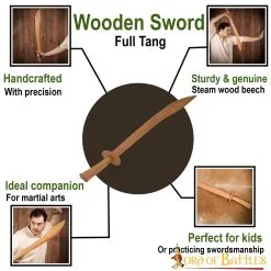 This sword is full tang and measures at approx. 83.2 cm (33 inches). It is meticulously handcrafted from ETHICALLY SOURCED steamed beech wood, making it extremely tough and durable.
