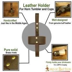Hanging right next to your mighty axe is this leather holder, hanging by your warrior belt, holding your favourite horn cup or even tumbler. The loops are firmly riveted to each other to support a robust construction.