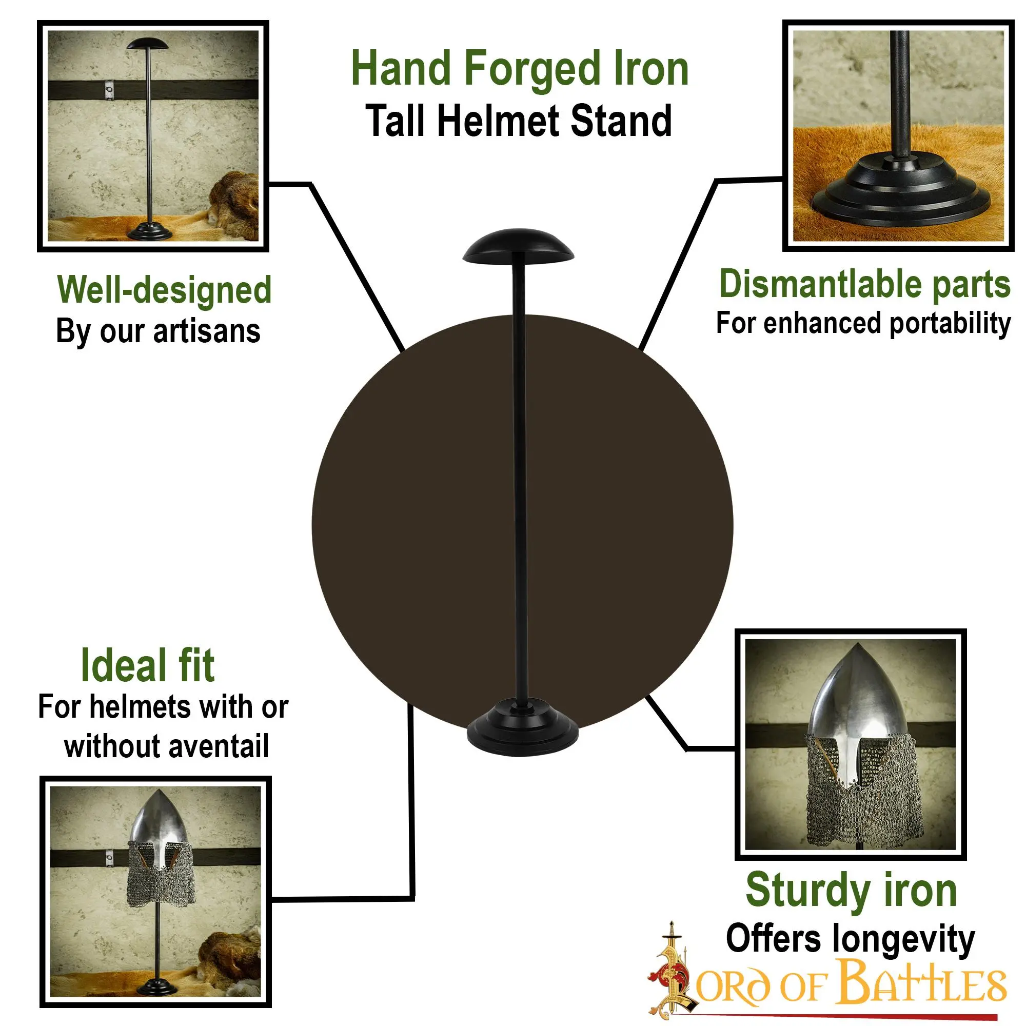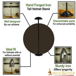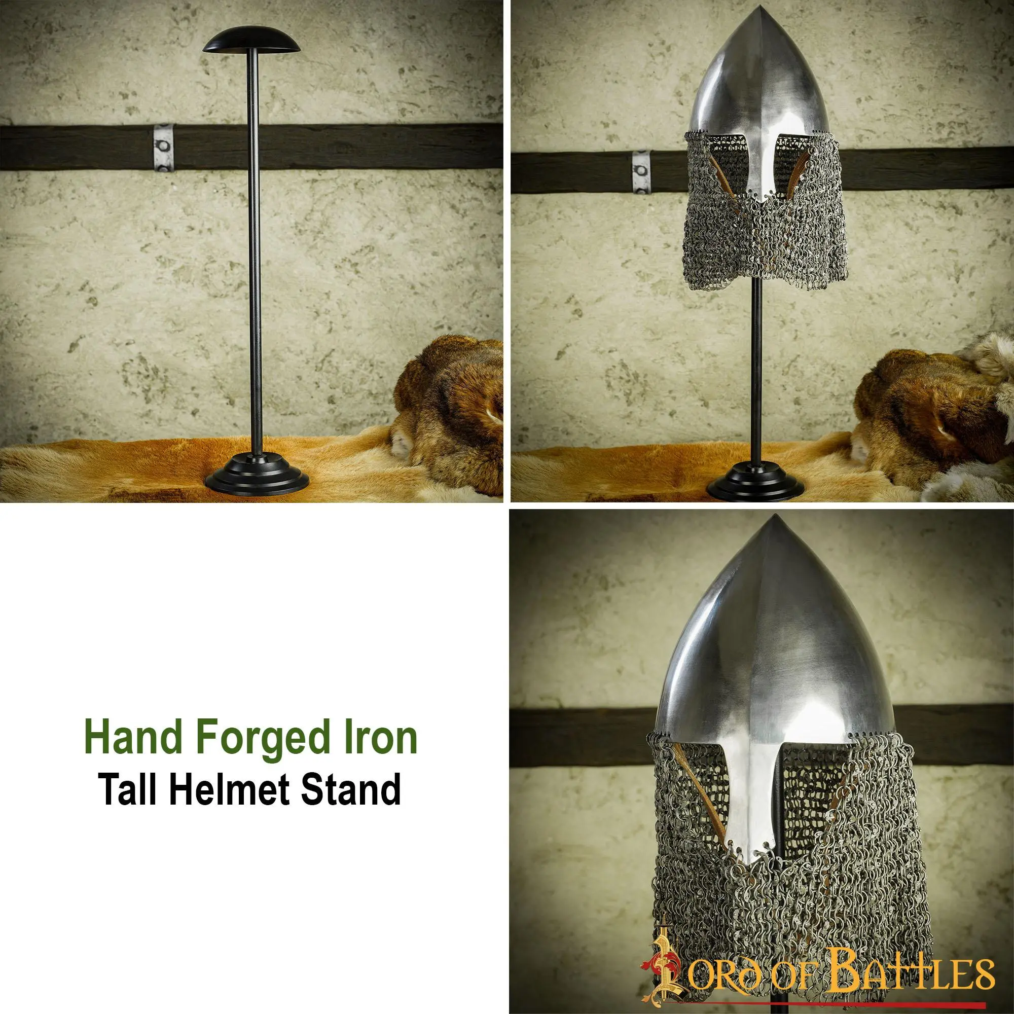 If you are a chivalrous knight or even an enthusiastic collector of mighty medieval helmets, our iron helmet stand will be the best accessory to showcase your glorious helms (with or without aventail or camail).