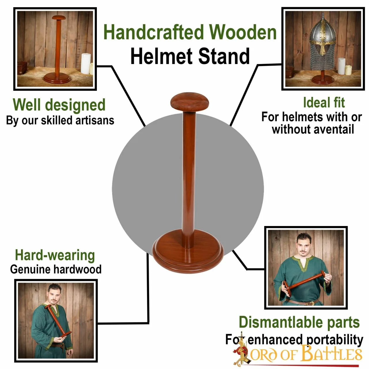 If you are a chivalrous knight or even an enthusiastic collector of mighty medieval helmets, our wooden helmet stand will be the best accessory to showcase your sturdy helms (with or without aventail or camail).