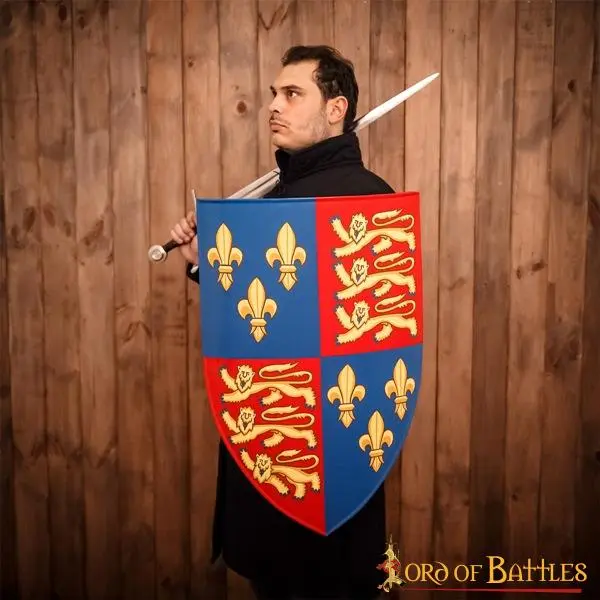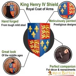 The royalty would reflect and an elite look would come forth when you add our King Henry IV Shield, a piece of historical art, to your décor. Firmly affixed, this shield will sync in well even with the most contemporary settings. The three golden lions passant guardant on a red field (gules) and three Fleur de Lis on a blue field (azure) are the most striking details, straight from the late Middle Ages.