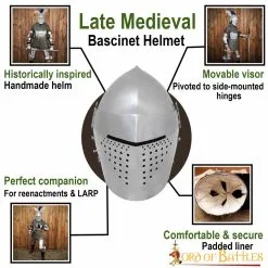The late medieval bascinet is an ideal helmet for a heavily armoured mounted medieval knight. It was quite popular among medieval armies because of its versatility and good balance between protection and mobility. Just attach one of our chainmail aventails (sold separately) to its vervelles, and you will get an optimum combination for your next LARP or reenactment, offering a great look and protection.