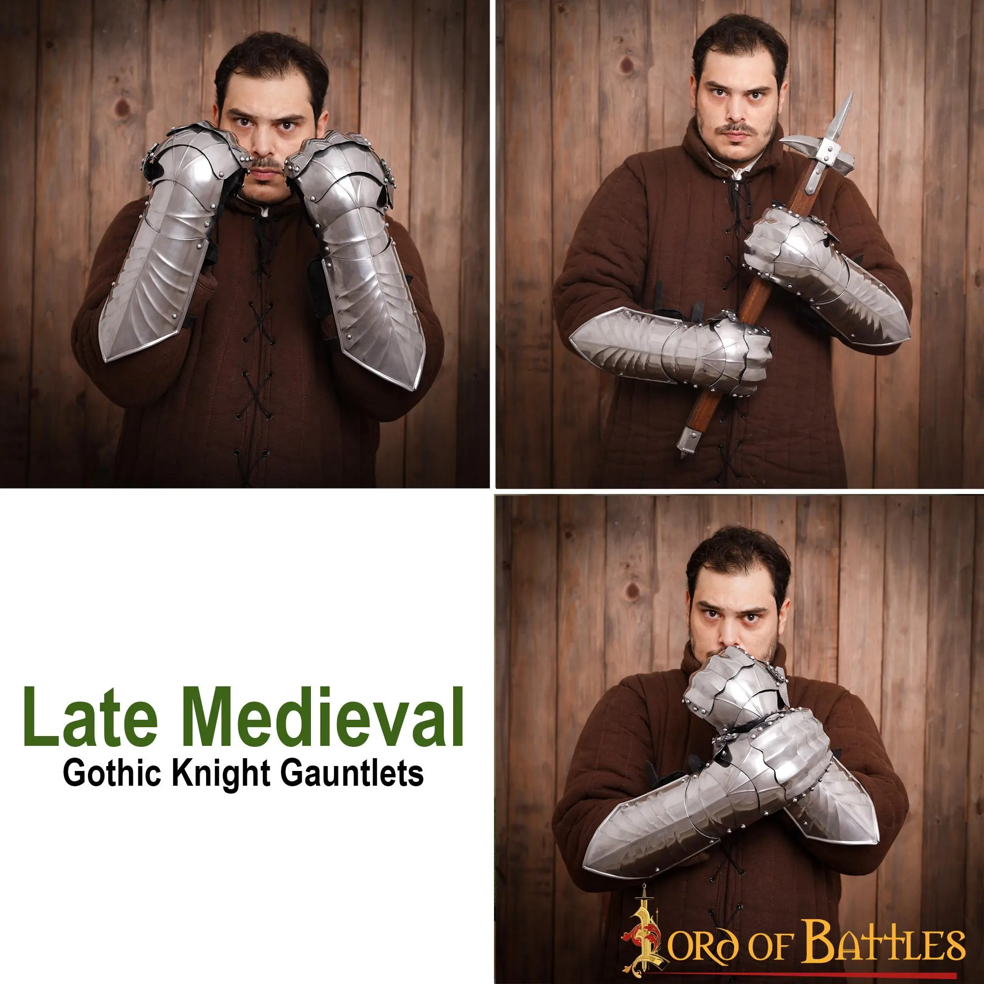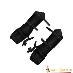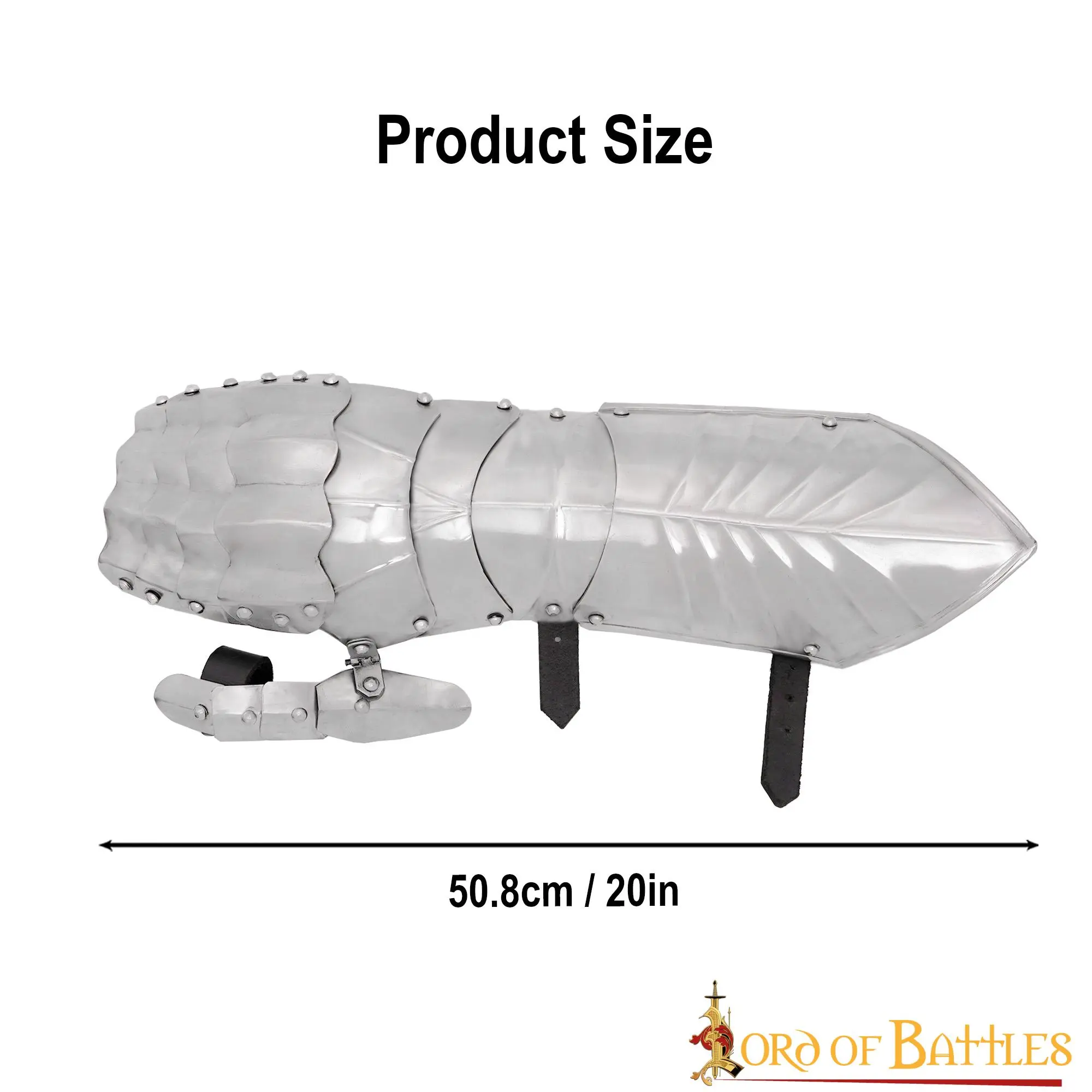 Meticulously handmade from sturdy 16-gauge MILD STEEL, these are sturdy and will last battle after battle. These fasten using robust leather straps and solid brass buckles. For better comfort and grip, these come attached with suede leather gloves. Its total length, when laid straight, is approx. 20 inches. Note: these gauntlets run in a large size.