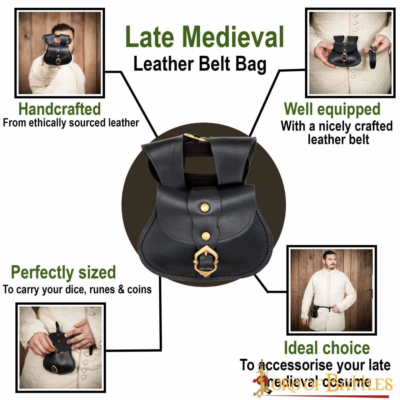 Its modest size (17 cm x 16 cm) makes it easy to carry around and match any outfit: the ideal choice to accessorize your favourite late medieval historical costume for your next event! NOTE: Since this is authentic buff leather, make sure to keep it away from moisture; clean it regularly with linen (or any soft cloth); if the stain pertains, damp cloth and some lather out of mild soap will do the needful.