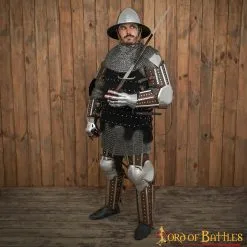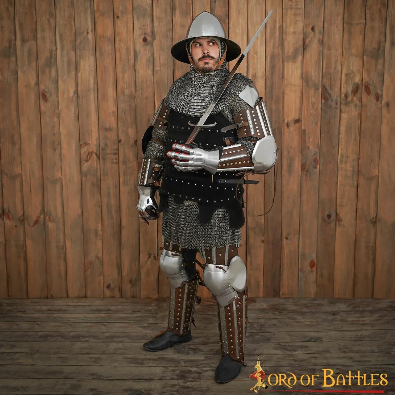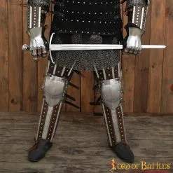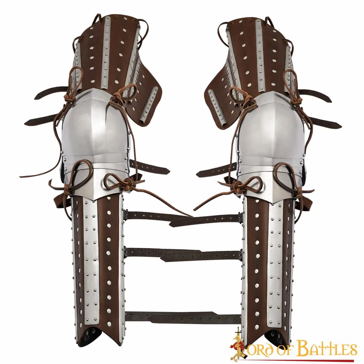 Well-designed by our skilled artisans from 3-3.2mm thick GENUINE LEATHER and STURDY 16 gauge MILD STEEL REINFORCING PLATES, it combines the best of the two worlds. They are FULLY FUNCTIONAL and are well suited for real-life combat or tournament. The set includes cuisses+ poleyns + grevaes and is easy to lace onto a pourpoint or gambeson. These run in ONE SIZE THAT FITS MOST.