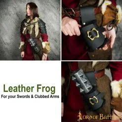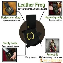 It is handmade from authentic buff leather (3-3.3 mm thickness). The buckle and strap are made highly adjustable for different shafts or scabbard widths. The total length of the frog is approx. 20 cm. NOTE: Since this is authentic buff leather, it has to keep away from moisture; clean it regularly with linen (or any soft cloth); if the stain pertains, damp cloth and some lather out of mild soap will do the needful.