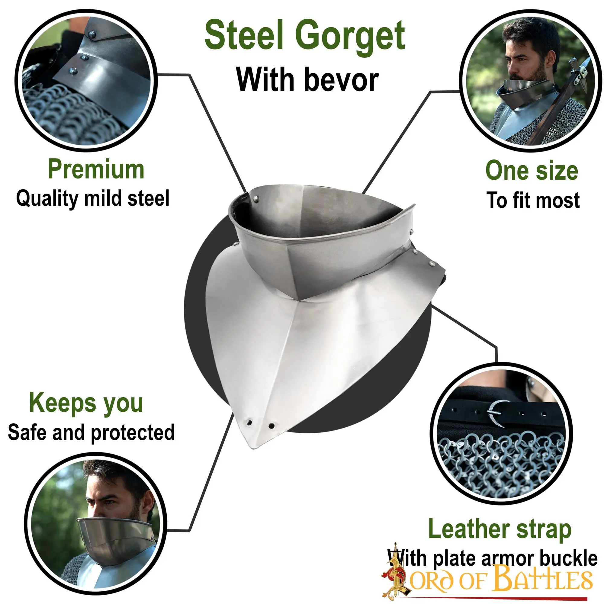 This gorget is an ideal armour for any knight or infantryman, offering reliable protection to the throat and upper chest. Pair it with a Sallet or an open-faced helmet that you fancy, and this historical gorget with falling bevor will bring you significant additional protection on the battlefield while always keeping the option to lower the plate covering your chin to catch your breath before returning to the fray!