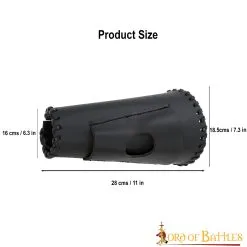 Painstakingly handcrafted from genuine BUFF LEATHER, these bracers are extremely robust and hard-wearing. For an adjustable fit, a pair of genuine leather straps with pure brass buckles is provided. Each bracer has a length of approx. 28 cm, upper width of approx. 18.5 cm, and lower width of approx. 16 cm.