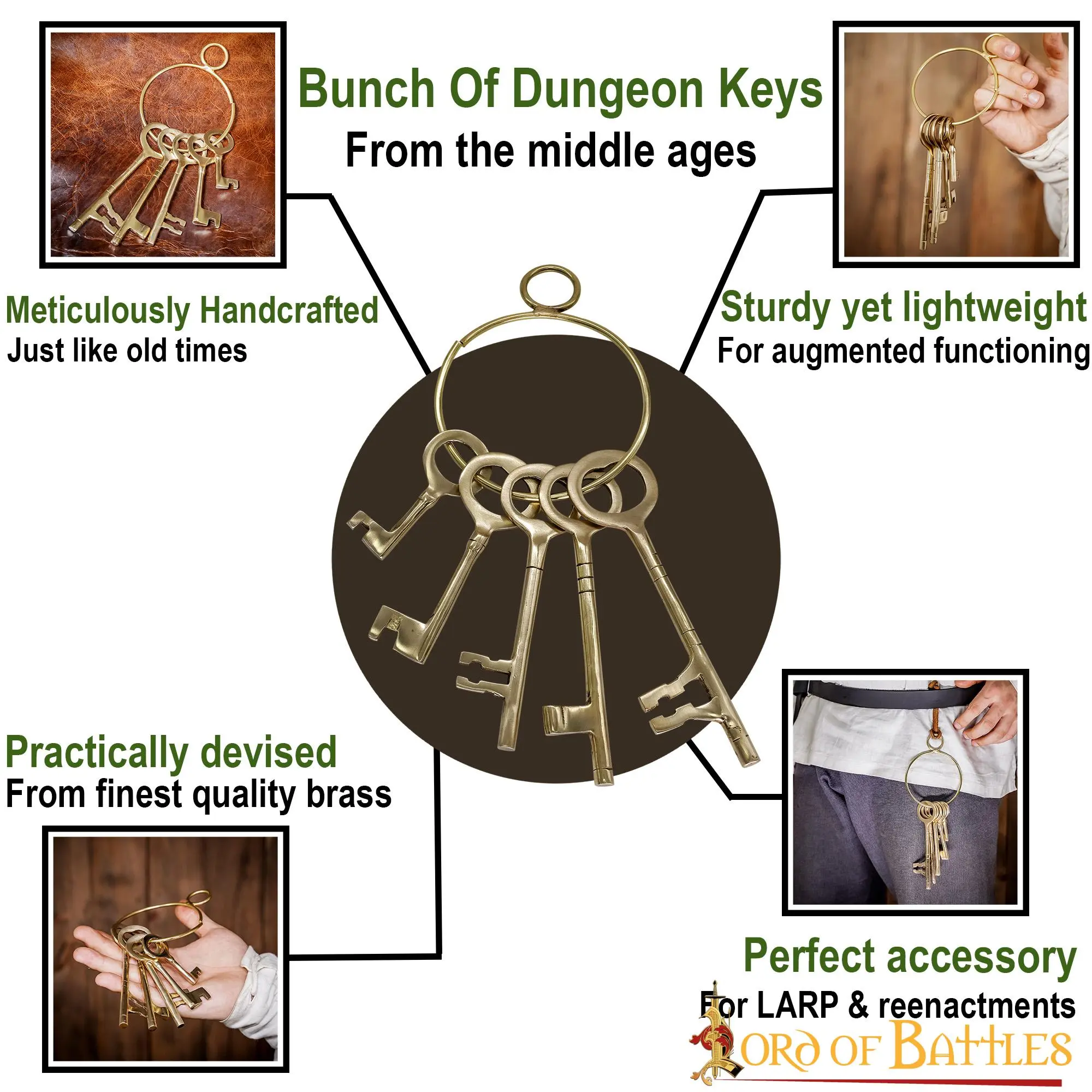 The best decorative bunch of keys is precisely what you need while you reenact the master of the dungeons or even the Elvish jailer of the Woodland realm, this bunch of gorgeous brass keys, hanging right by your belt, will undoubtedly enhance your outfit!