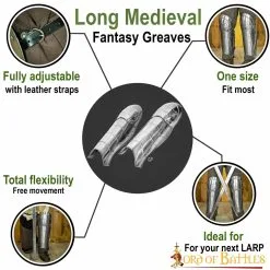These greaves are handmade from 18 gauge mild steel and are sturdy yet lightweight, ideal for fantastic LARP and Cosplay outfits. When worn, they are firmly held in place by two robust leather straps at the back. This pair comes in one size that fits most.