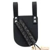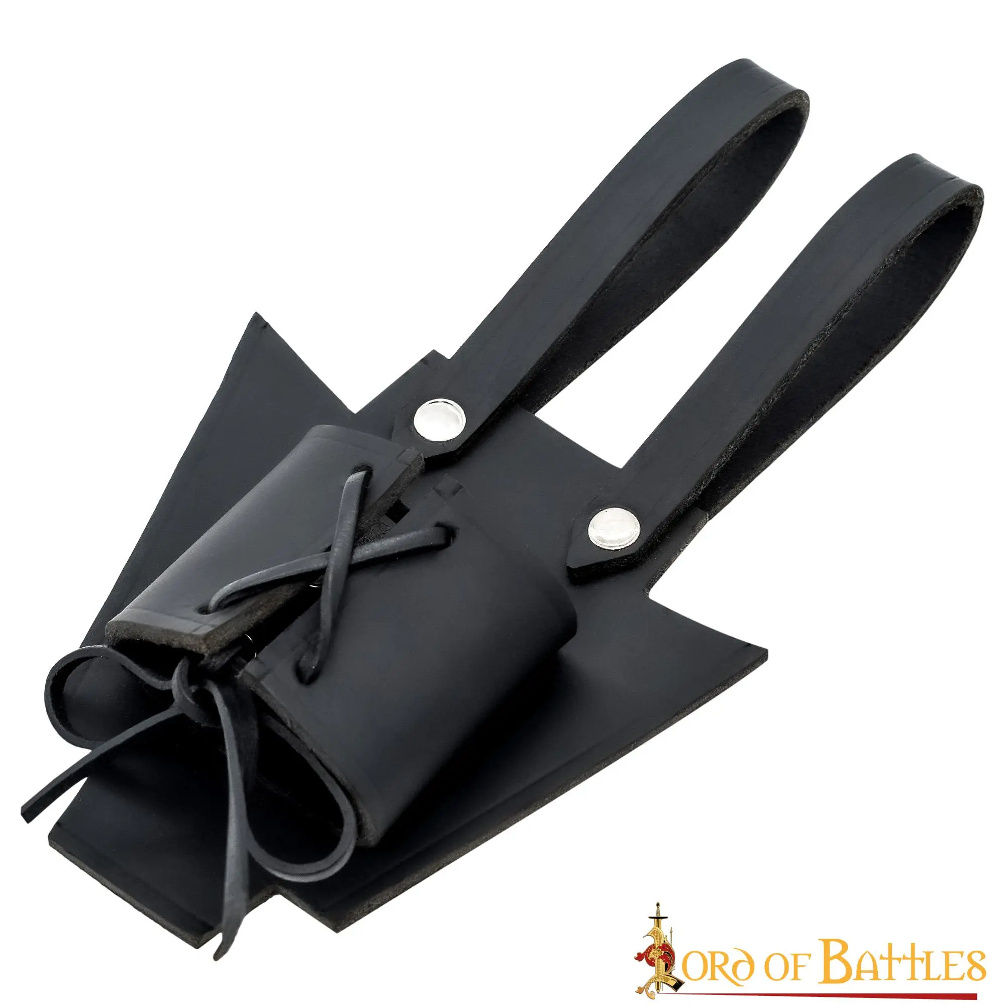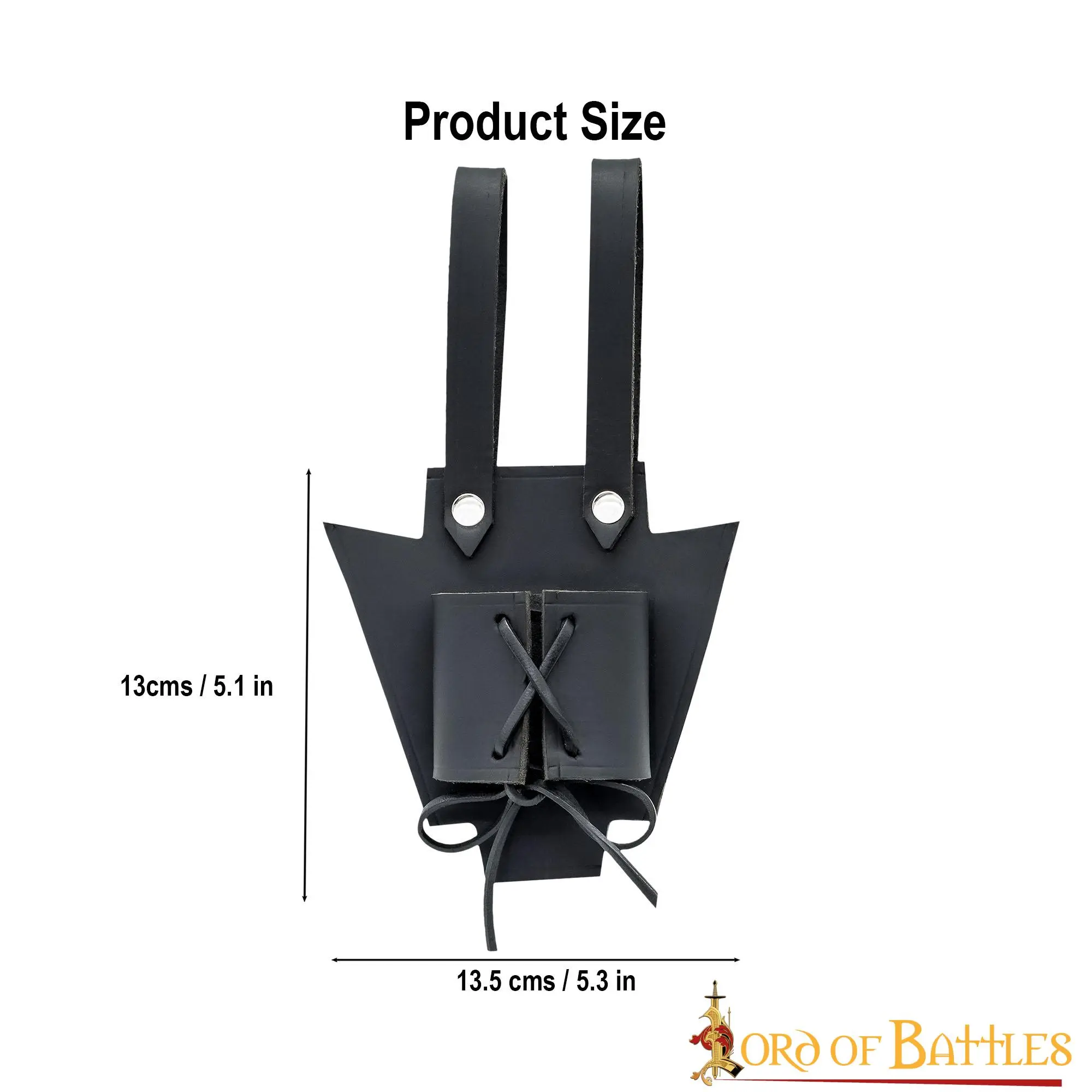 It is meticulously HANDCRAFTED from GENUINE BUFF LEATHER. The holder has adjustable strings for variable weapon widths (for different swords and axes). The loops are attached to the frog with antique brass rivets that can easily fit a belt of width 10cm. Its dimensions are approx. (13 X 13.5) cm.