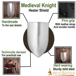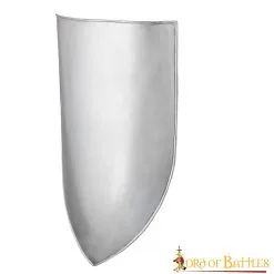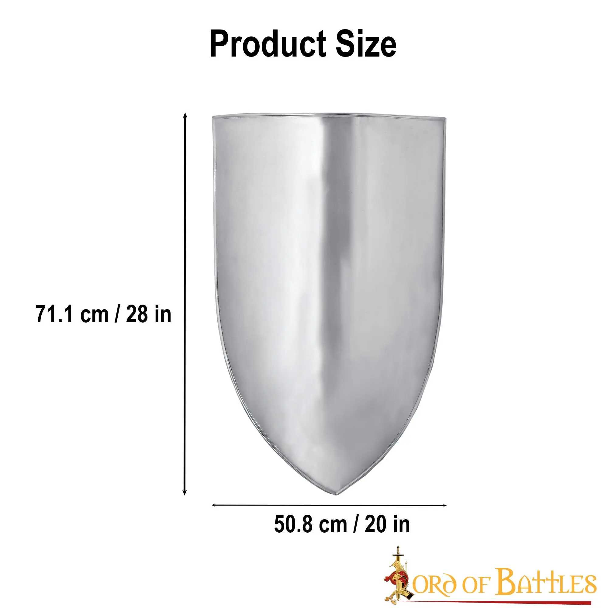 This shield, 28 inches in length and 20 inches in breadth, is meticulously handmade from 18 gauge MILD STEEL. For a firm grip and better shock-absorbing, this shield has an adjustable leather strap and a metal handle reinforced with wood.