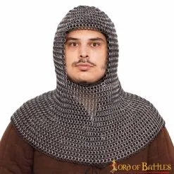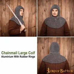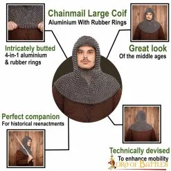 This coif utilizes a unique mail constructed of 14 gauge aluminium round rings, 10mm diameter, alternating with rubber solid rings. This method yields an extremely lightweight yet durable shirt for use where ease of wear is important. The material is very forgiving of the size and shape of the wearer, conforming naturally to the body; the elasticity allows for unrestricted movement. The combination of comfort and great looks makes this a preferred mail type for Theater, Costume, and Movie productions, making it durable enough for LARP as well.