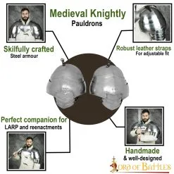 This large pair of Medieval fantasy Steel Pauldrons with articulated plates of 20 gauge mild steel is the ideal accessory for any knight or heavy infantry soldier from your favourite fantasy universe.