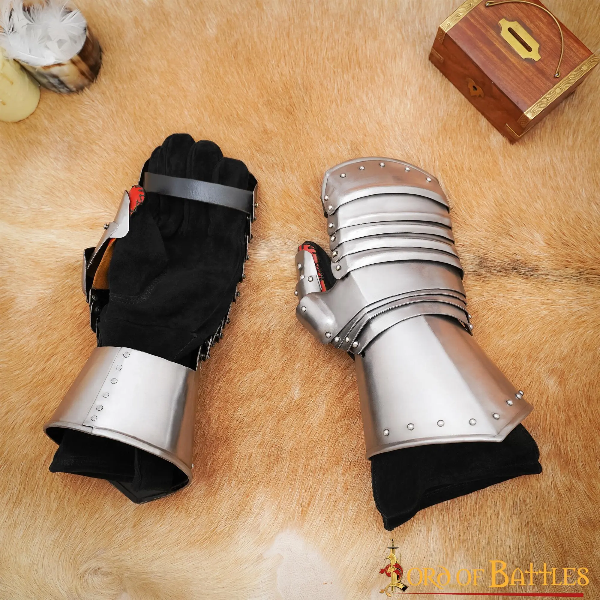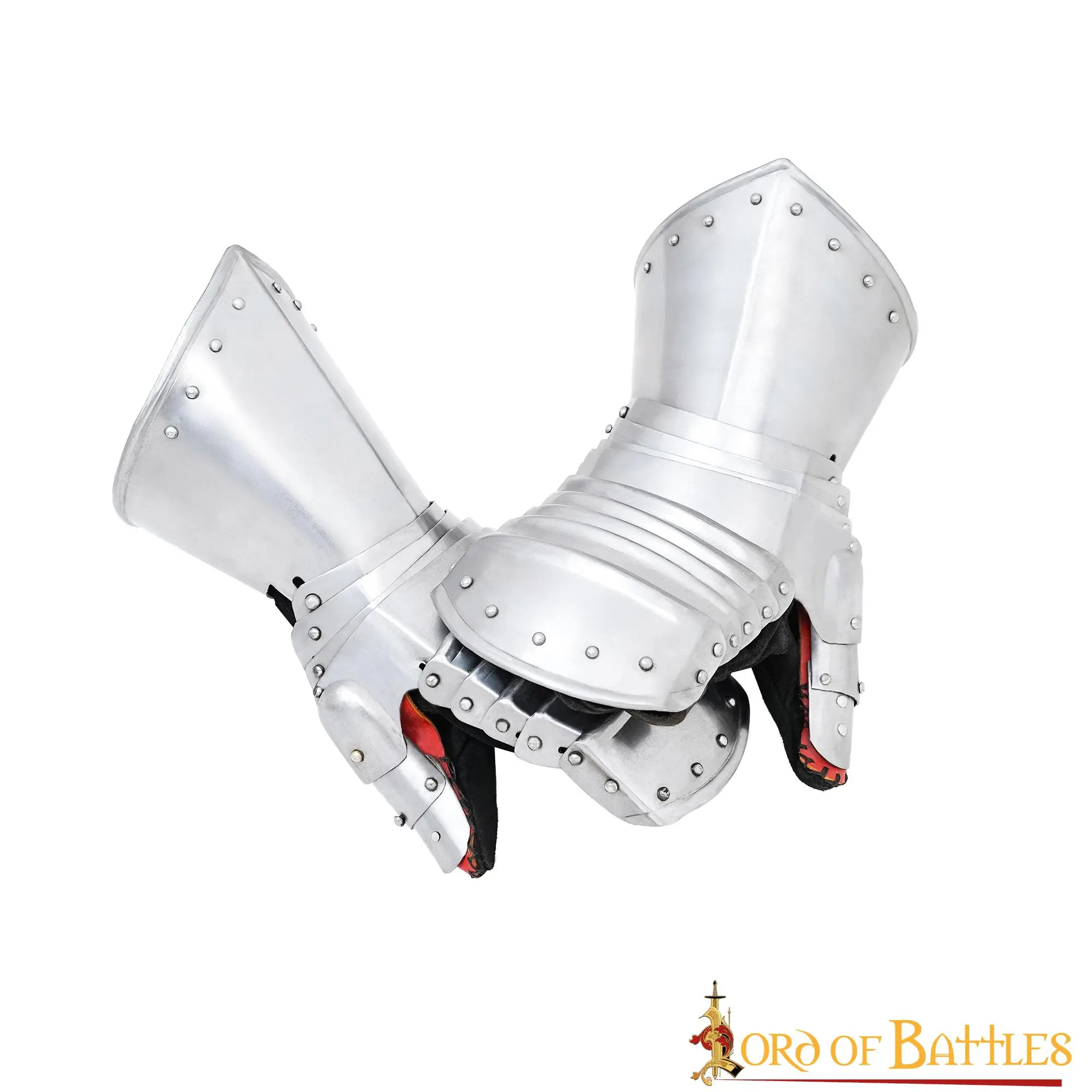 Our pair of 15th Century Maximillian gauntlets come in a mitten style with multiple articulated plates to enhance mobility for your historical re-enactments or even real-life combats, as a fierce mounted knight! For added comfort and enhanced shock-absorbing, these gauntlets are lined with supple GENUINE SUEDE GLOVES.