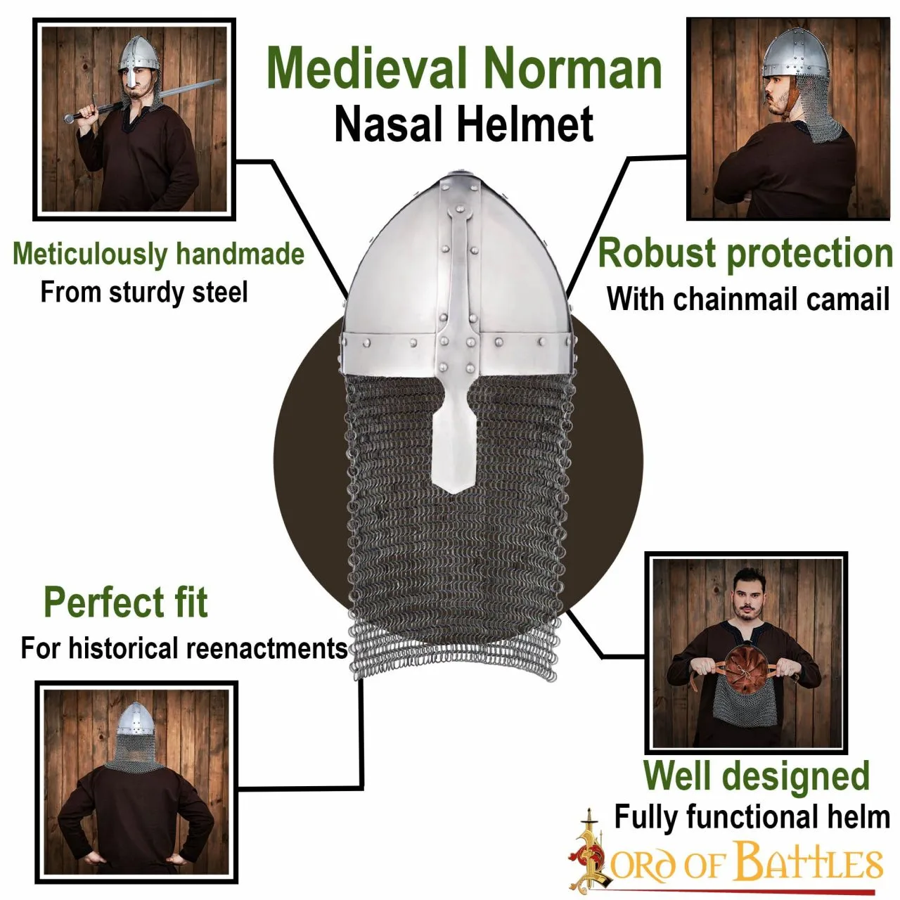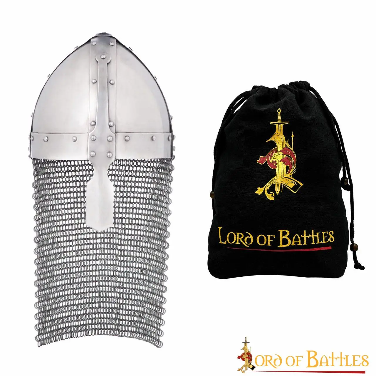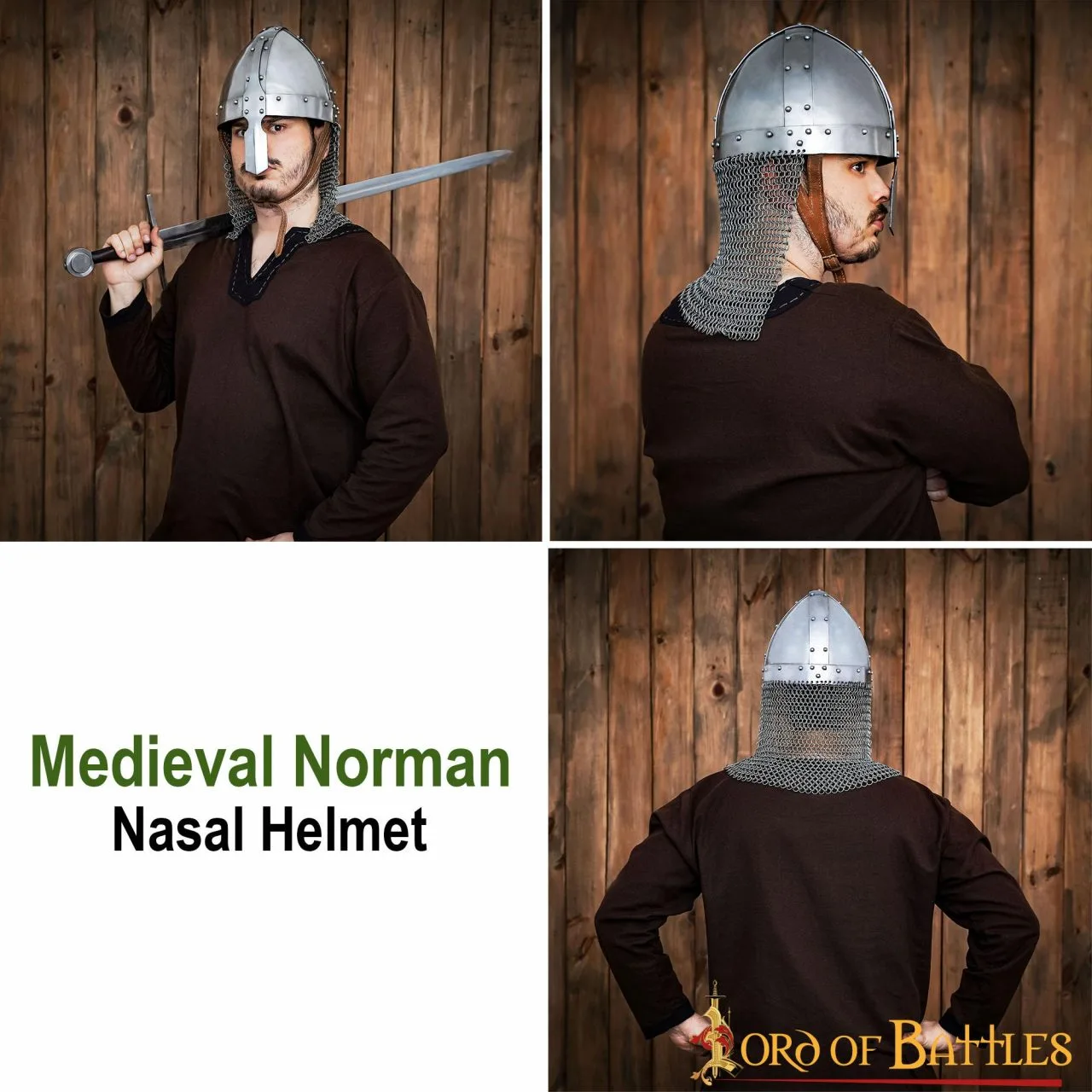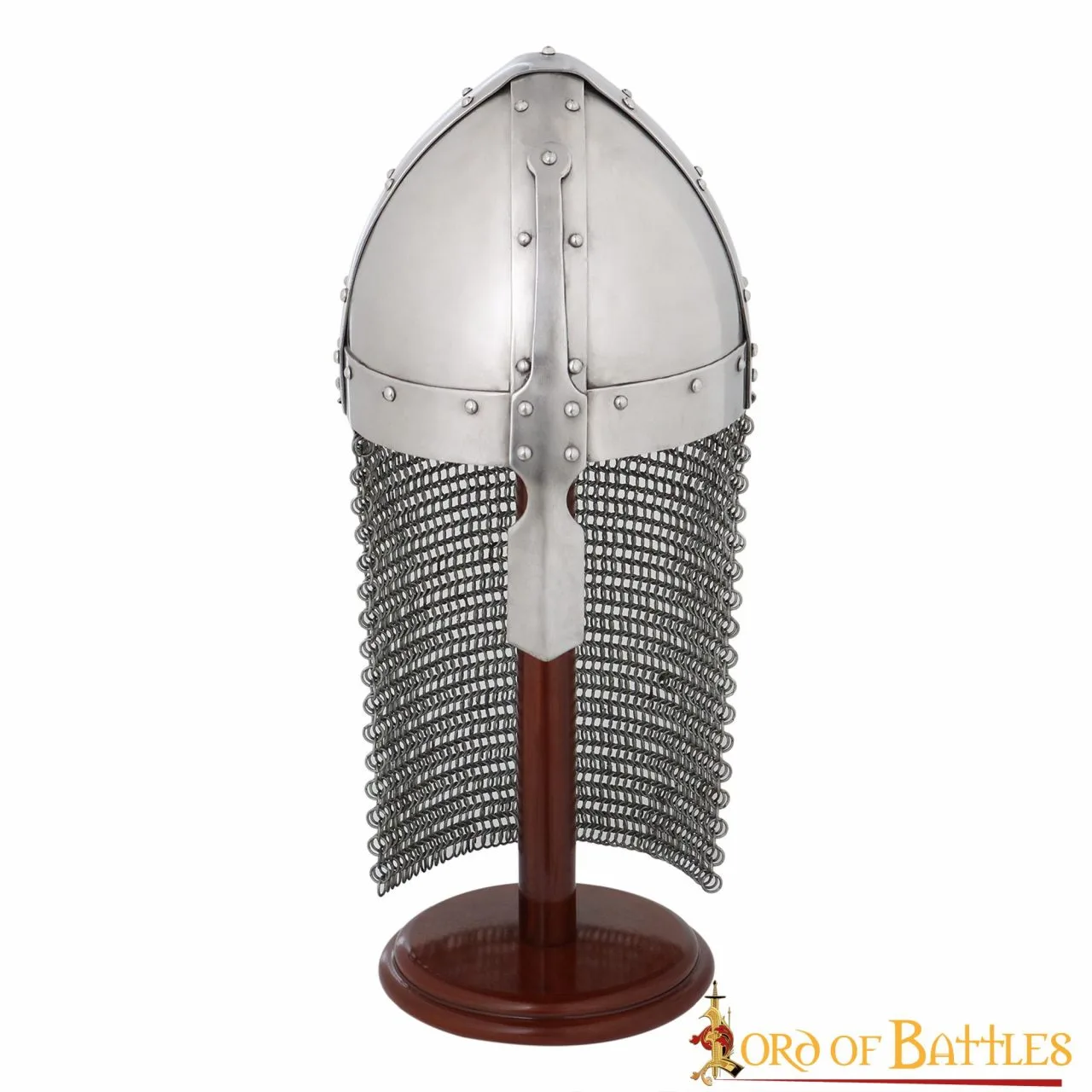 The Bayeux tapestry, depicting the Norman invasion of Saxon England, features this nasal helmet that was popular at the time. During the Battle of Hastings, William the Conqueror had to lift this specific helmet to prove he was alive after rumors of his death spread through his army! It comes with an attached butted chainmail aventail making it ideal for your next LARP event! It can be worn by a variety of characters, from humble archers to mighty Norman knights!