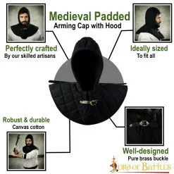 This medieval padded arming cap is the perfect accessory that will make the wearing of your plate armour or chainmail much more comfortable. It will give an extra layer of protection to the most sensitive part of your body and especially the collar bone, which is quite painful when you are wearing a cuirass on top of that. The attached padded arming cap makes it more comfortable for you to wear your favourite helmet or mail coif even more comfortable.