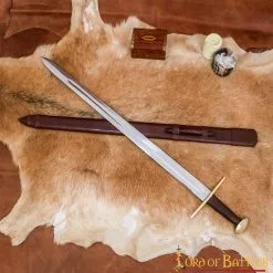 This sword is HAND FORGED from tough CARBON STEEL that makes it sturdy enough to last for years. For the best grip, this sword comes with a brazil-nut shaped PURE BRASS pommel and a leather-wrapped handle. Its total length is approx. 96.5 cm.