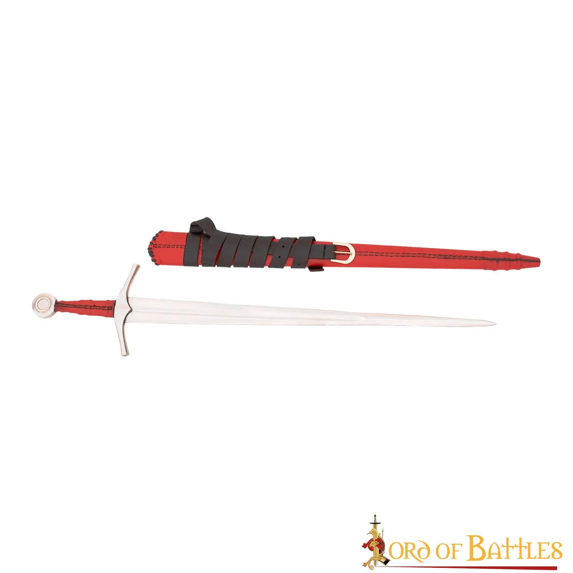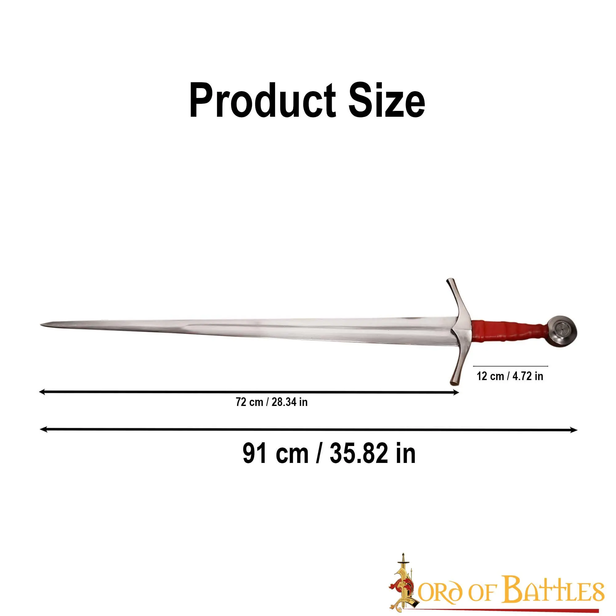 This sword is HAND FORGED from tough CARBON STEEL, making it durable and offering longevity. The total length of this sword (including the handle and pommel) is approx. 35.82 inches. For you to carry it conveniently to all your quests, this sword comes with a genuine leather scabbard and belt.