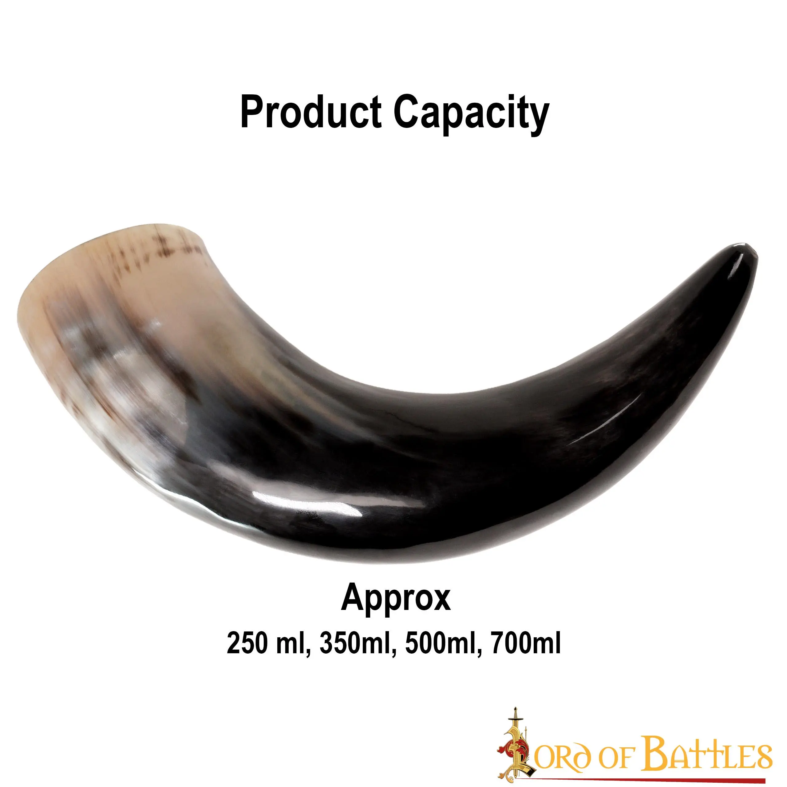 This horn is available in four distinct capacities of 250 ml, 350 ml, 500 ml, 700 ml (of a liquid with up to 20% alcohol content). Please avoid dishwashers and hot beverages. Before use, make sure to wash under running water. For a longer life, treat with bees’ wax after each use. Please note this is a natural product that decays with time and, hence cracks may come.