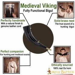 This bigul is designed for hunting and medieval events, hence the genuine leather cord making it more portable. It is HANDCRAFTED from ETHICALLY SOURCED OX HORN, lasting longer than its synthetic counterparts. The SOLID BRASS REED enables the sound of a true hunting bigul. The horn has an approximate length of 12-13 inches. Please note that it is a natural product and a variation in size and colour must be considered. It is a natural product that decays with time and, hence cracks may come.
