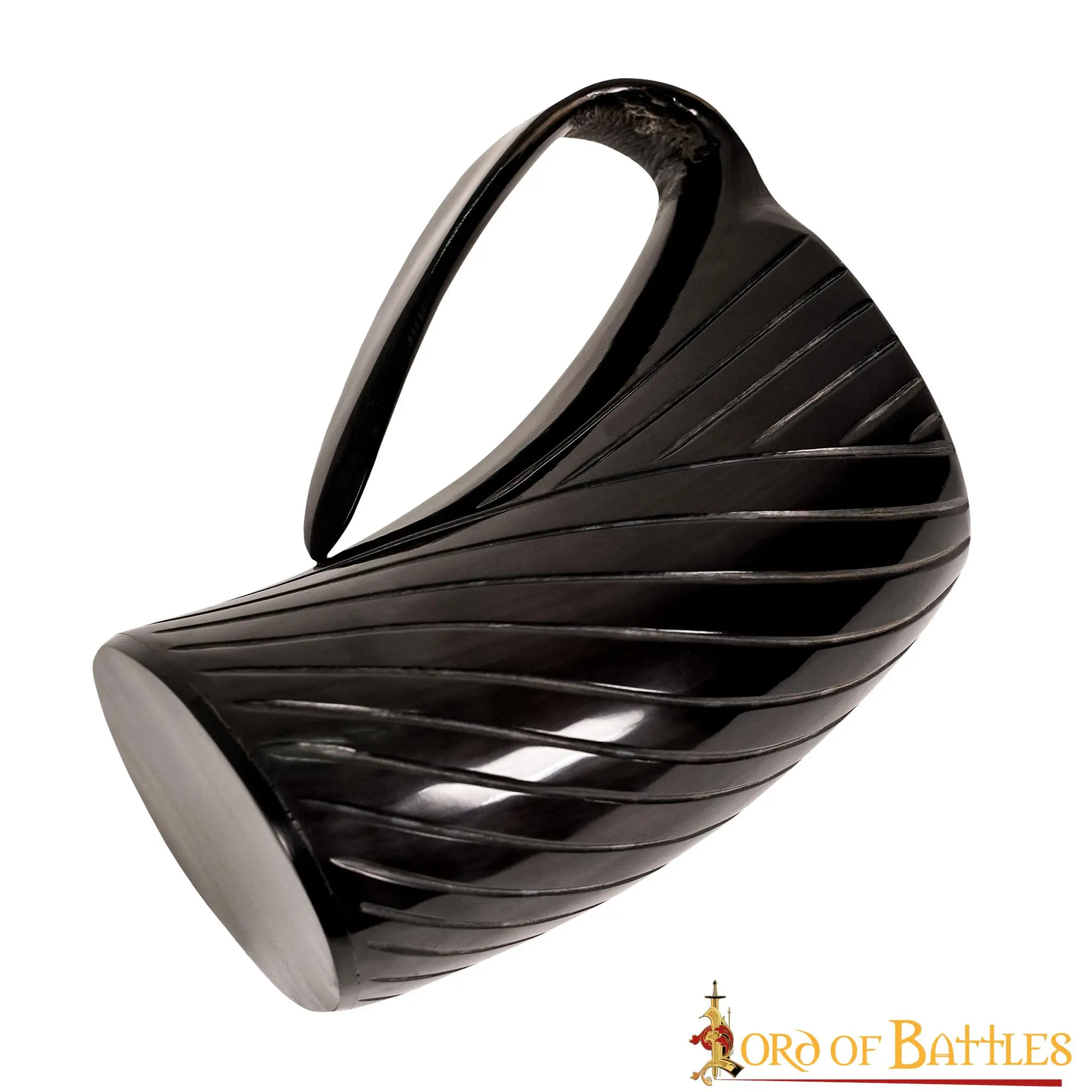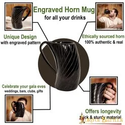 This tankard is handmade from REAL BOVINE HORN, ideally sized at approx. 600 ml. It is 0% leak locked and is suitable for cool liquids which have up to 20% alcohol content. Please avoid dishwasher and hot liquids before use, make sure to wash under running water. For a longer life span treat with bees’ wax after each use. Please note this is a natural product that decays with time and hence, cracks may come.