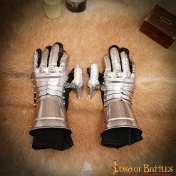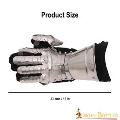 Crafted with great attention to detail, these gauntlets are handmade from durable 20-gauge mild steel, ensuring that they will last year after year. Secured by robust leather straps and solid brass buckles, they feature small leather fittings at the tip of each finger to provide a secure grip. For added protection against the sharp edges of plate armor, makes sure to wear the unstitched genuine suede gloves that come with the gauntlets. With a total length of approximately 13 inches when laid out flat, these gauntlets are suitable for almost anyone who desires to wear them.